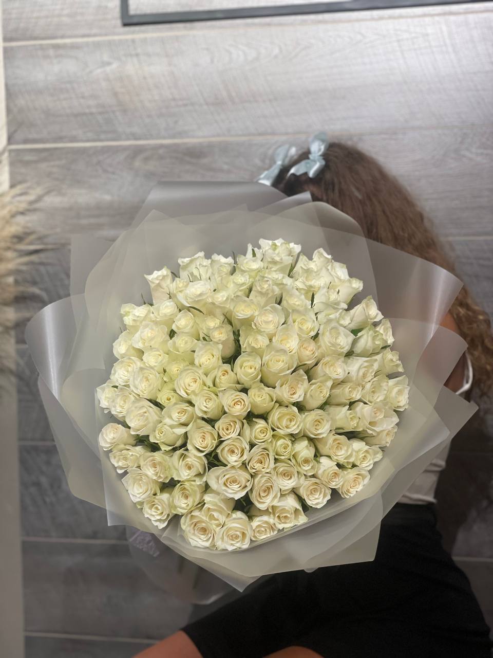 Сто одна белоснежная роза из Кении собрана в монохромную композицию с безупречной геометрией. Каждый бутон держит форму и создаёт плотное облако света. Для момента когда слова не нужны.