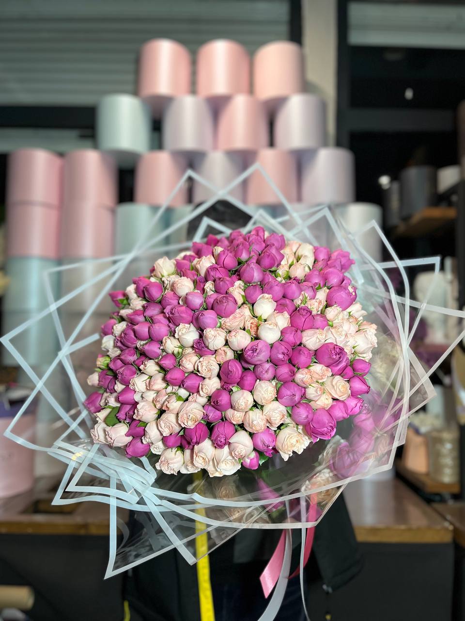 101 кустовая пионовидная роза, лента, дизайнерская упаковка.