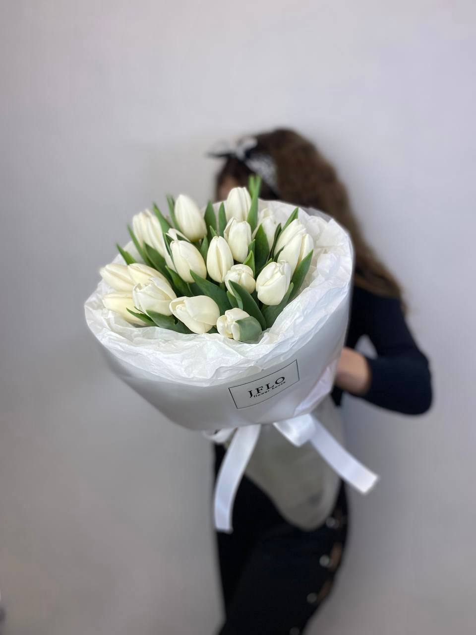 Девятнадцать белых тюльпанов собраны в плотный монобукет с ровными линиями и чистым силуэтом. Белизна лепестков создаёт ощущение света и пространства.