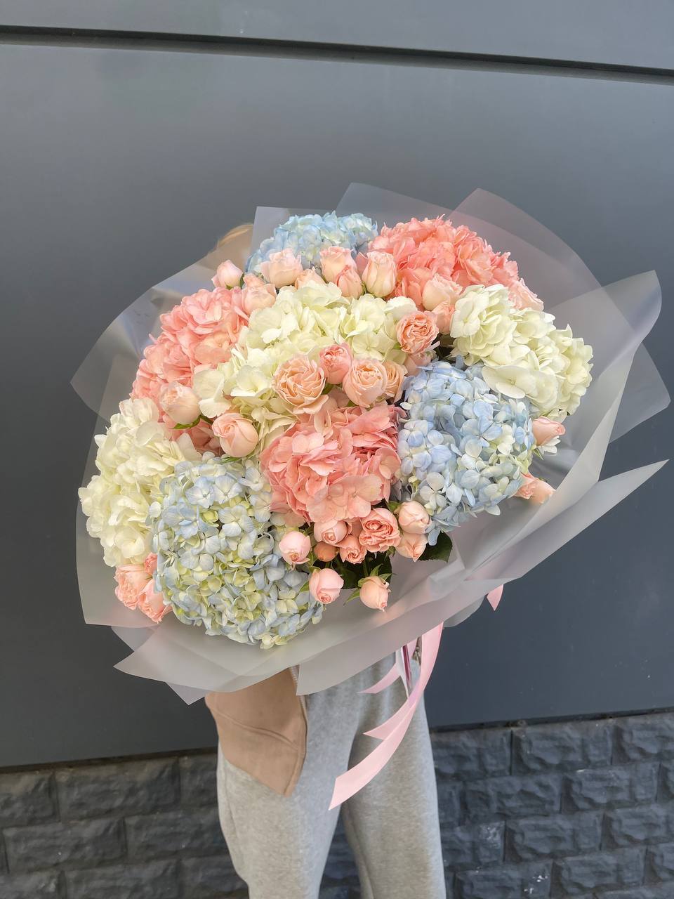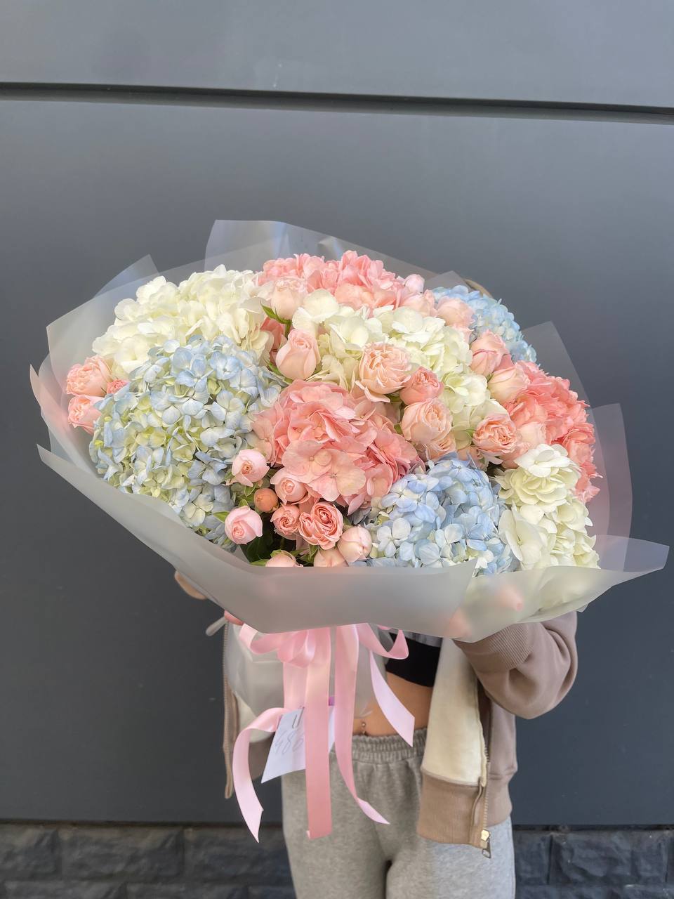 Пять крупных соцветий гортензии в бело-розовой гамме образуют воздушную композицию с переливами света на лепестках. Букет выглядит объёмно и свежо, наполняя пространство мягким цветом.