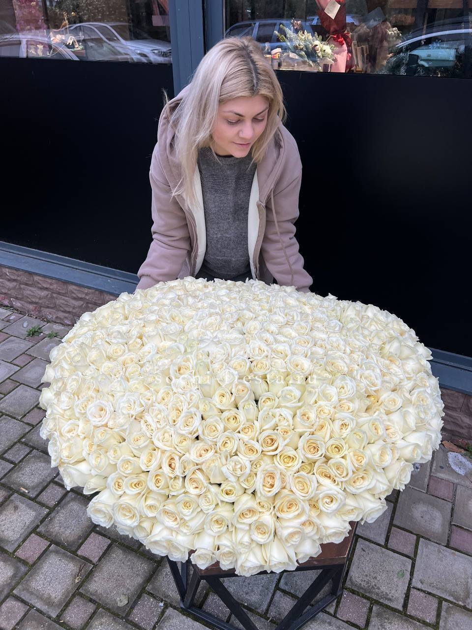 Пятьсот один бутон выстроены плотными рядами в глубокой корзине. Белоснежная композиция создаёт эффект цветочного облака, способного заполнить собой всё пространство вокруг.
