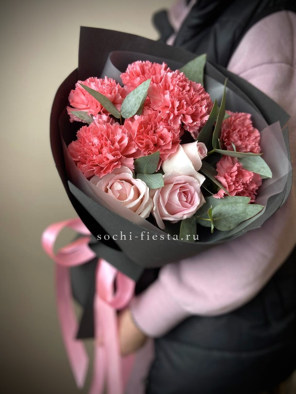Пышная композиция объединяет крупные соцветия гортензии с бархатными розами и воздушной эустомой. Мисти бабблс и диантус создают мягкую дымку вокруг центральных бутонов. Веточки эвкалипта добавляют свежести и завершают образ.