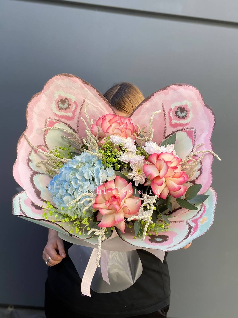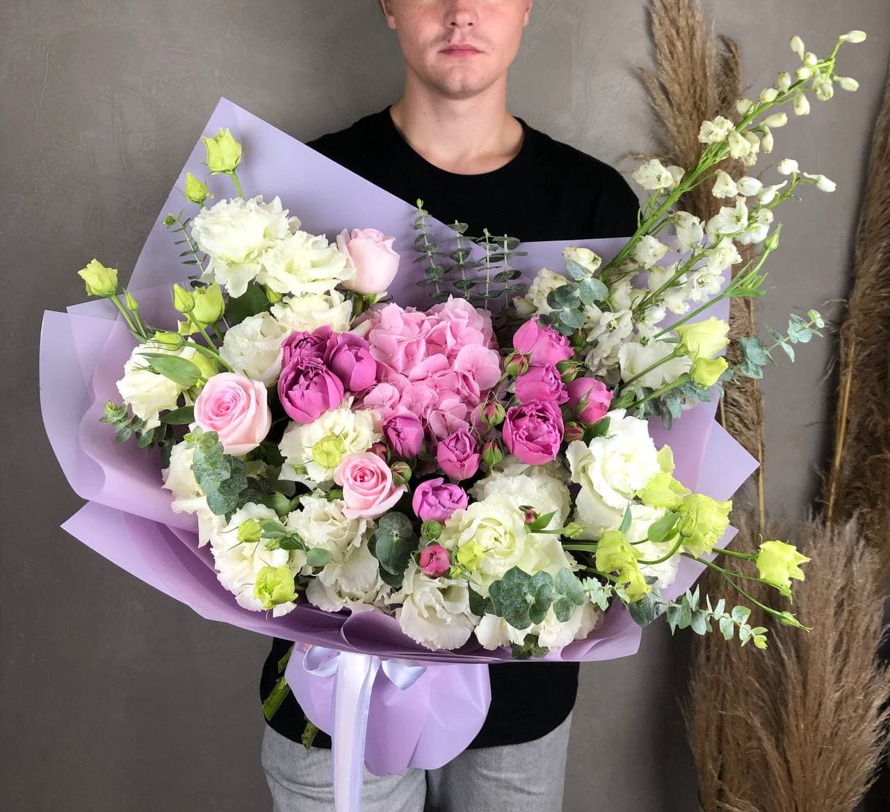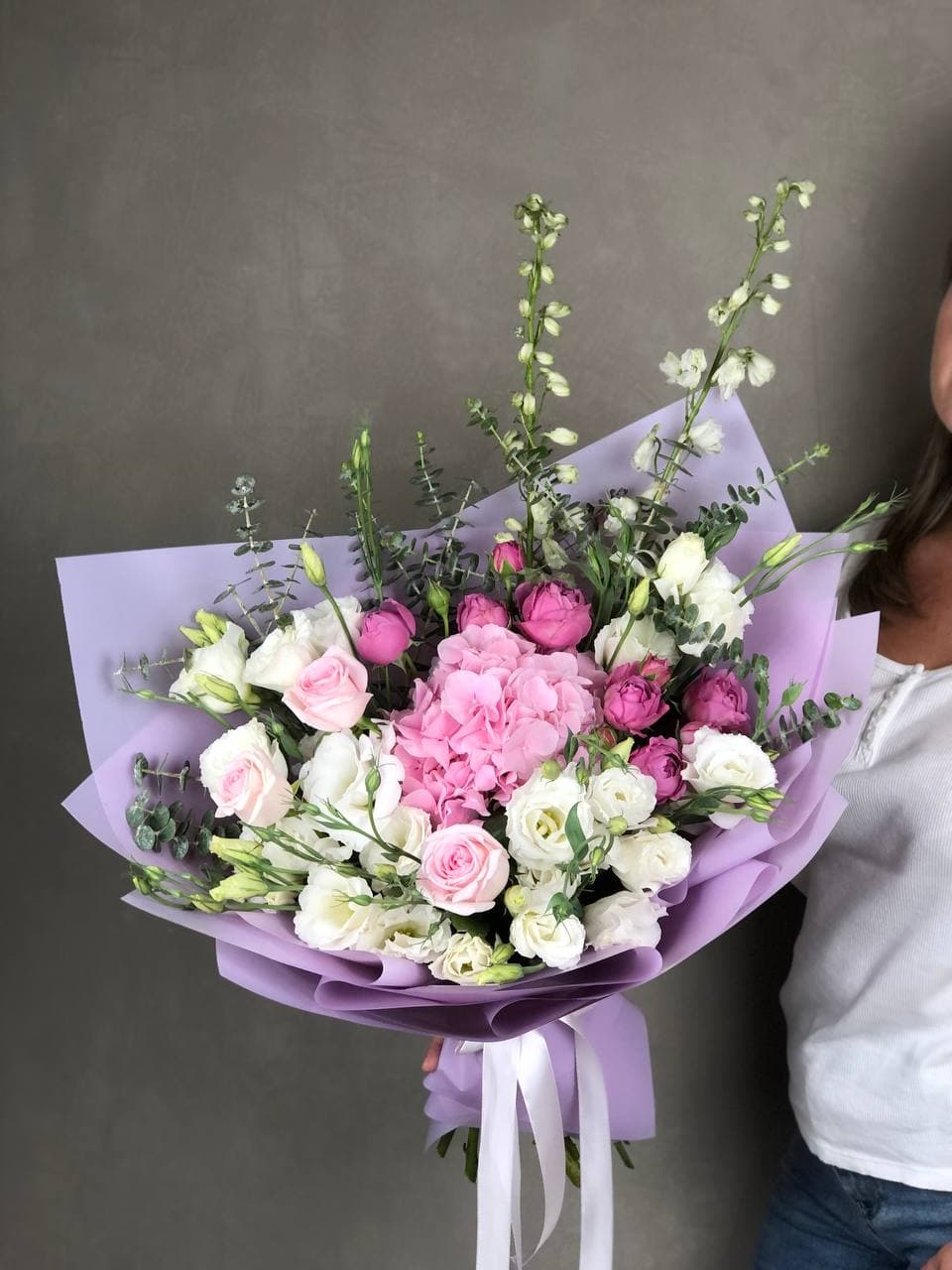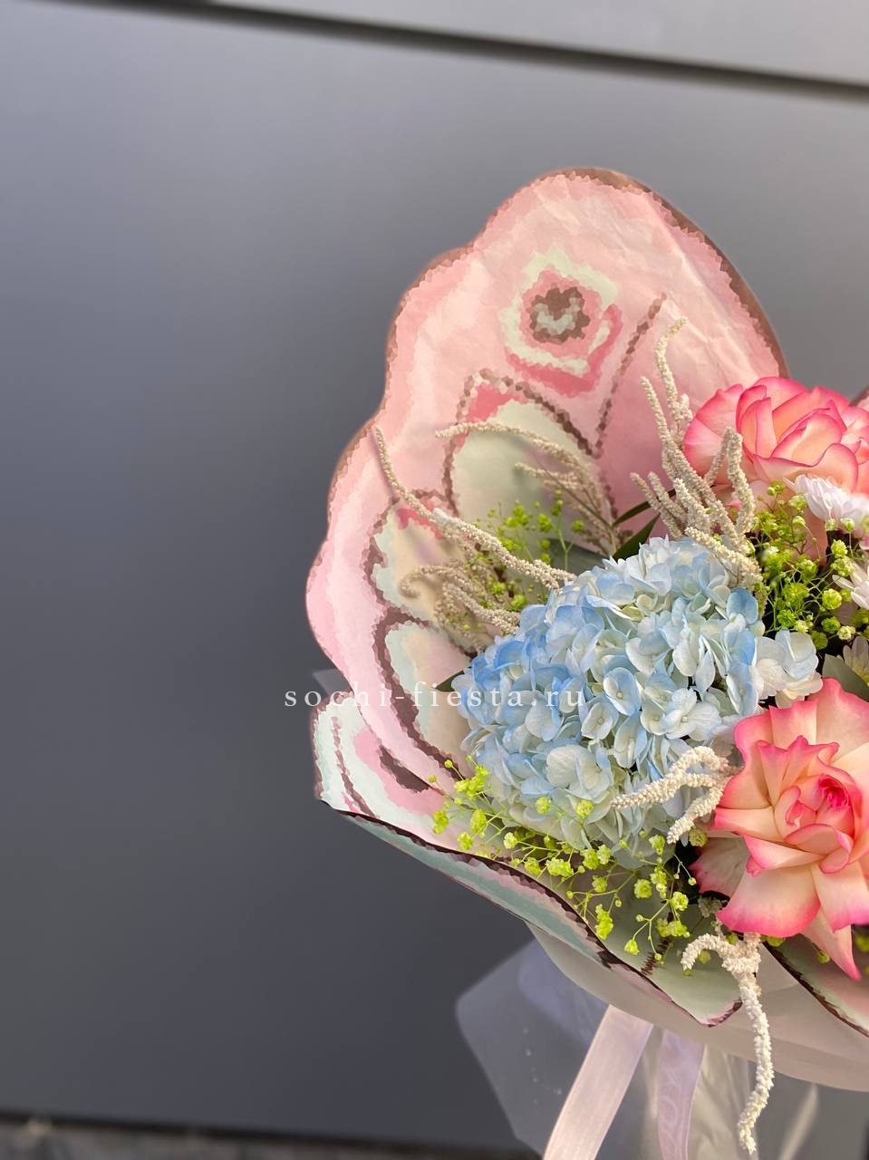 Сочетание пышной голубой гортензии и классических белых роз — это гимн нежности и чистоты. Букет, который не просто удивляет своим масштабом, но и дарит ощущение безмятежности. Идеальный выбор для самого искреннего признания.