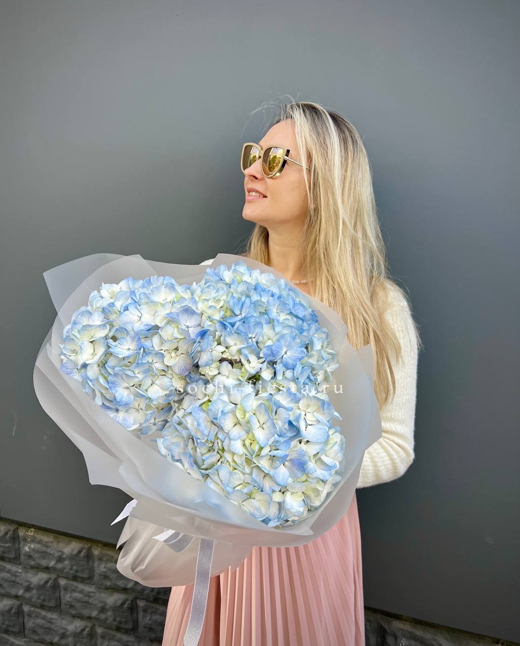 Три пышных шапки голубой гортензии образуют округлую форму с естественной асимметрией. Каждое соцветие раскрыто полностью, создавая впечатление объёмного облака в руках.