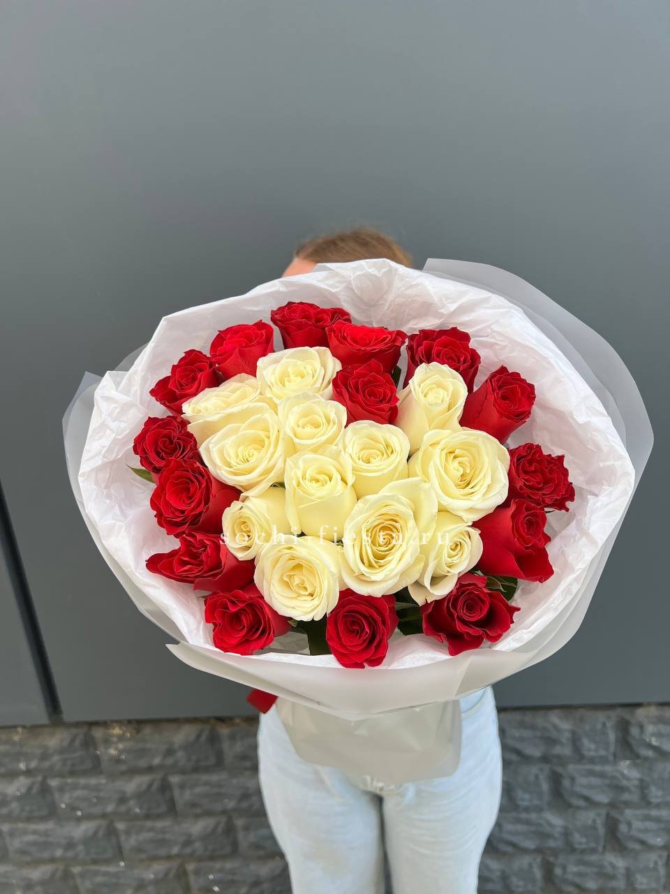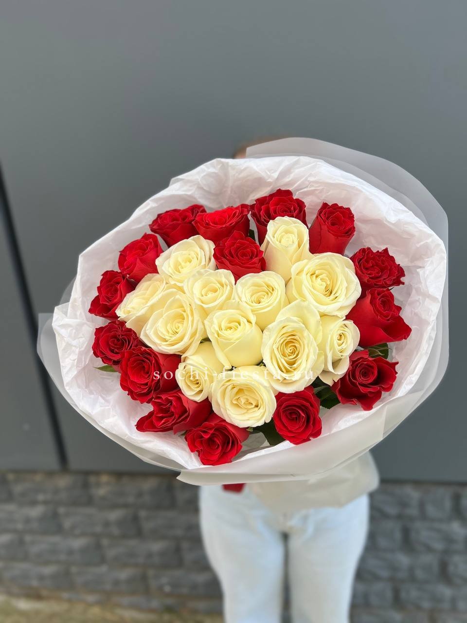 Изначальная цена указана за букет из 15 роз Состав букета на фотографии: 21 кенийских роз, лента, упаковка.