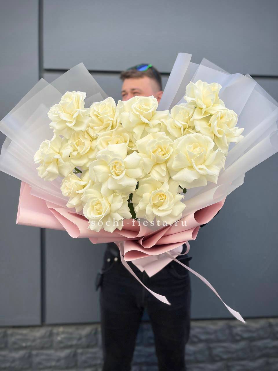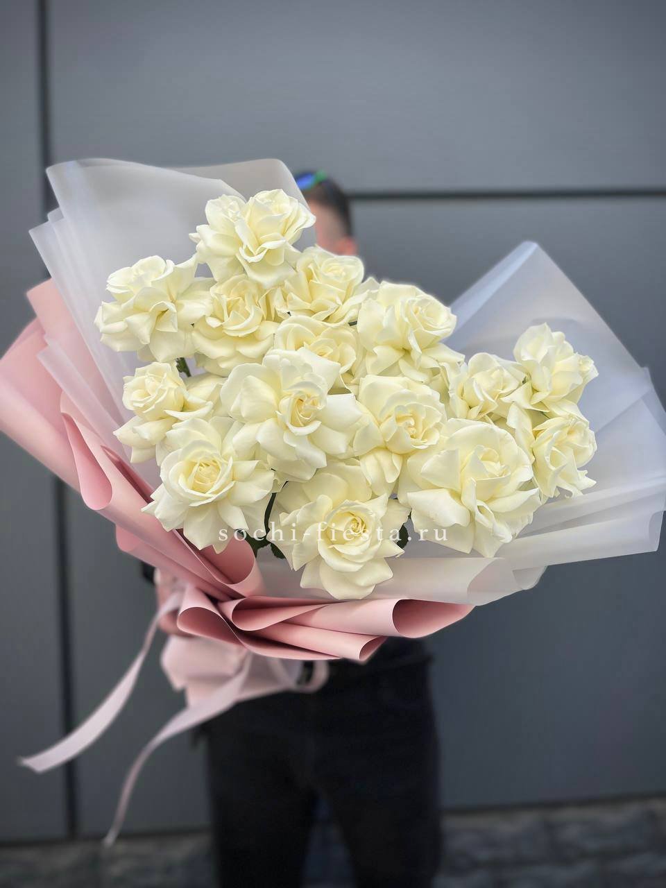 розы пионовидные белые и кремовые - 31 шт., лента, крафт.