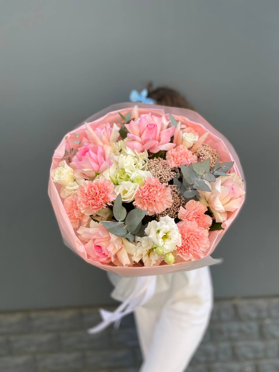 мисти бабблс, диантусы нежных оттенков, эвкалипт, авторское оформление.