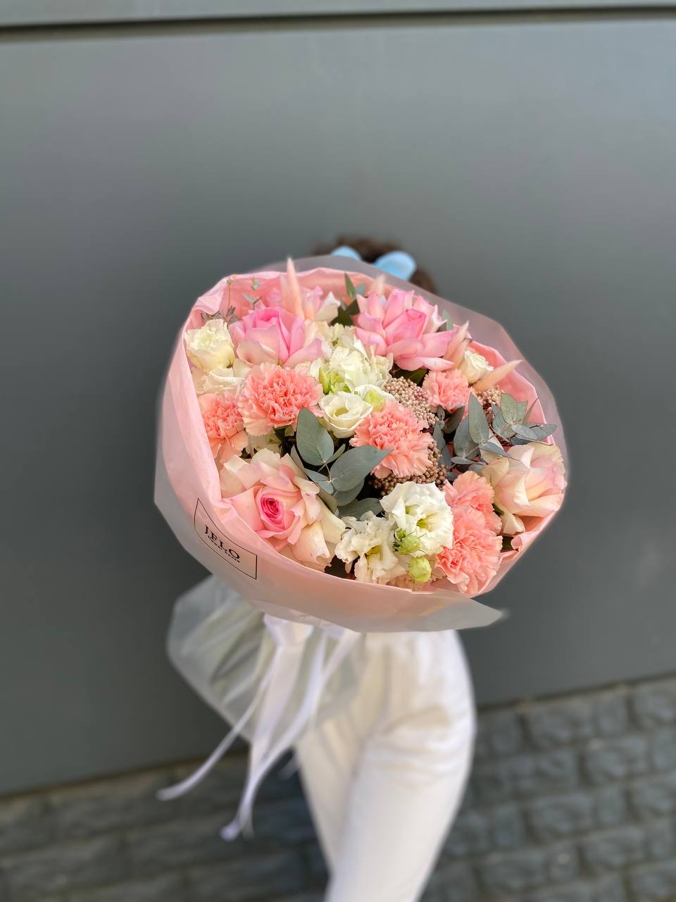 Воздушные кисти мисти бабблс переплетаются с яркими диантусами создавая объёмную текстуру. Эвкалипт добавляет свежести и завершает композицию лёгкими зелёными нотами.