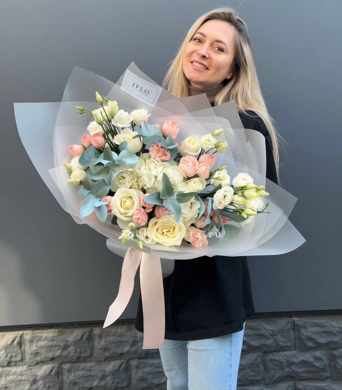 розы, гортензия, эустома, эвкалипт, дизайнерская упаковка.
