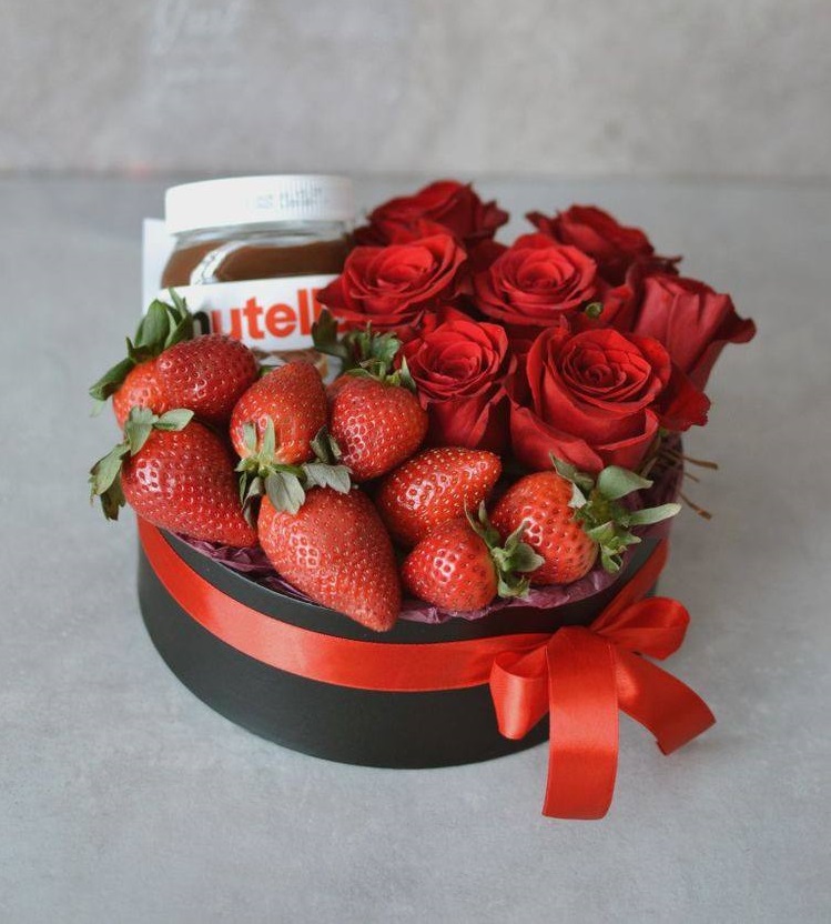 200-300г. ароматной клубники, розы - 7 шт., паста Nutella 180г., бокс D20 (цвет бокса может быть согласован с клиентом), лента.