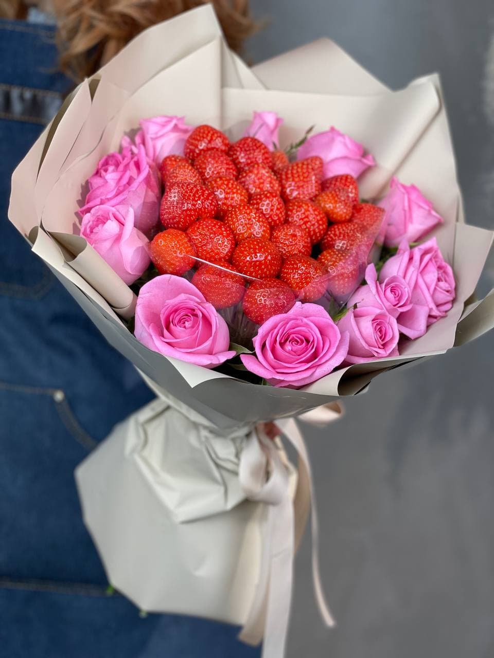 Одиннадцать розовых роз и спелая клубника собраны в букет с чёткой геометрией. Дизайнерская бумага удерживает форму, ягоды распределены равномерно между цветами.