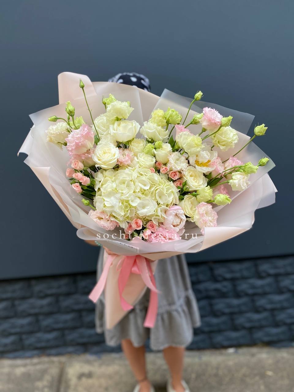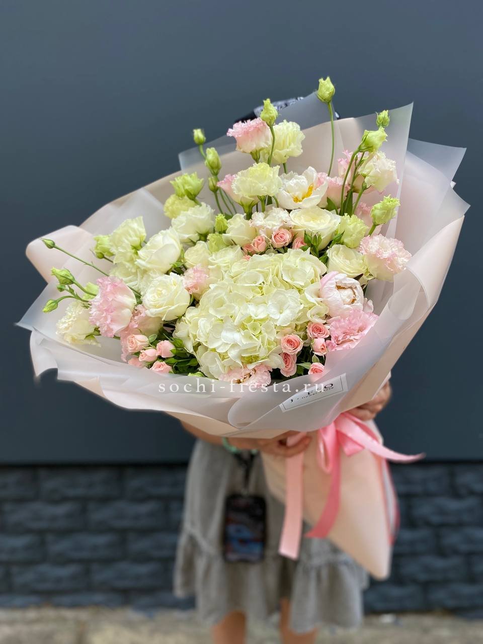 гортензия, герберы, эустомы, розы, диантус, эвкалипт, лента, дизайнерская упаковка.