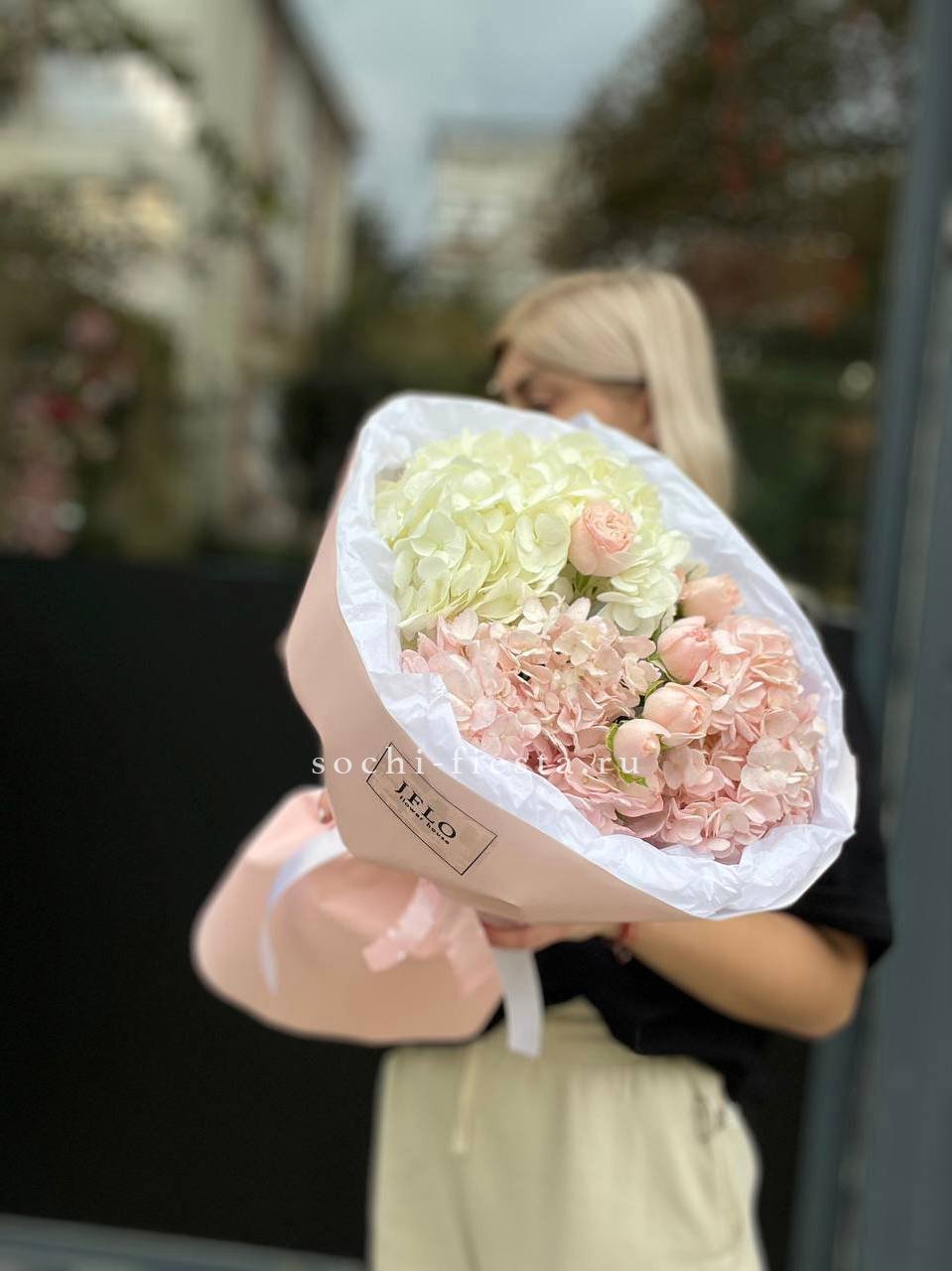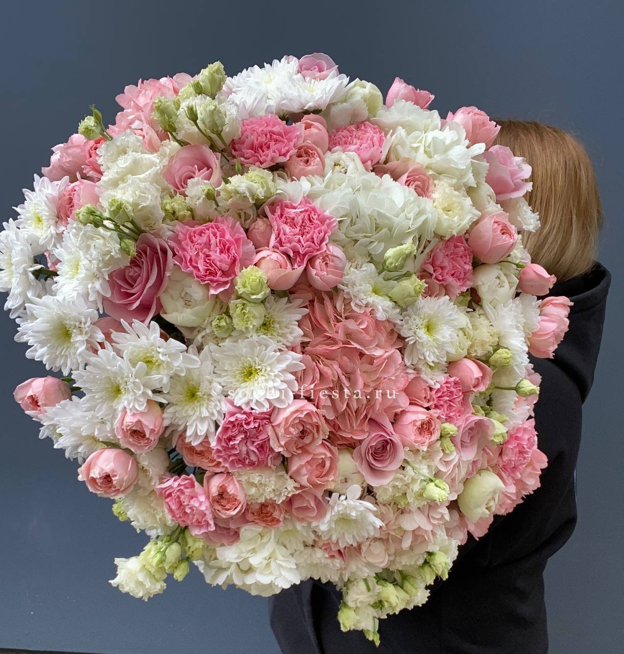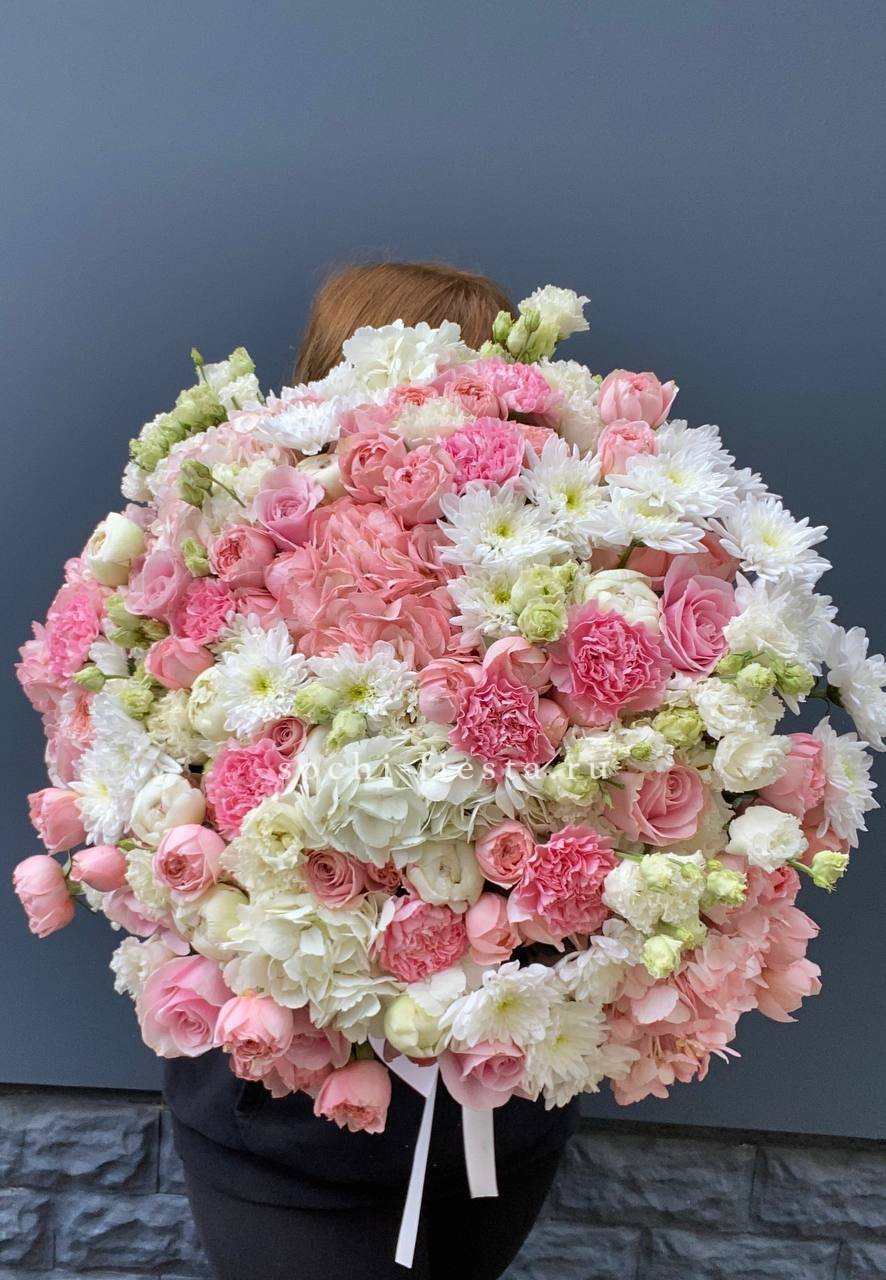 Пушистые шапки Мисти Бабблс переплетаются с классическими розовыми бутонами, создавая объёмный силуэт с мягкими переходами. Композиция собрана плотно, каждый цветок занимает своё место в общем ритме.