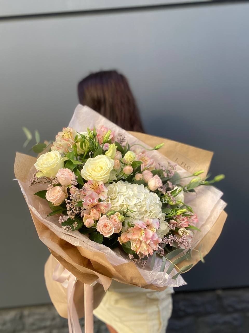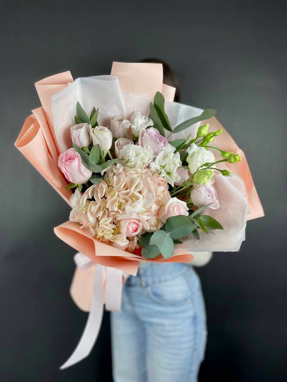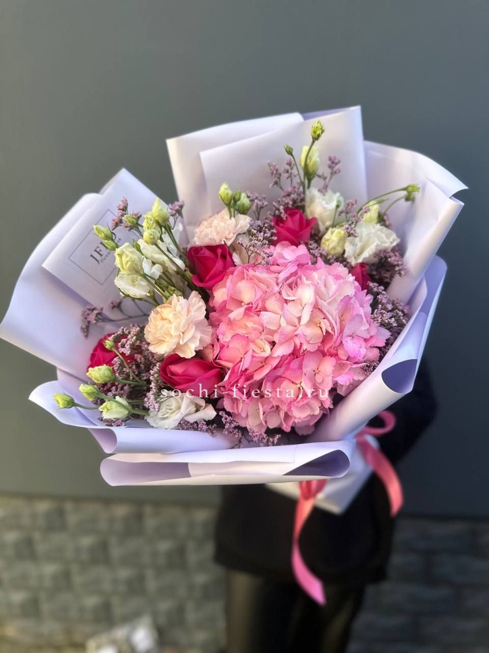 маттиола, розы, гортензия, диантусы, хризантемы , лента и дизайнерская пленка.