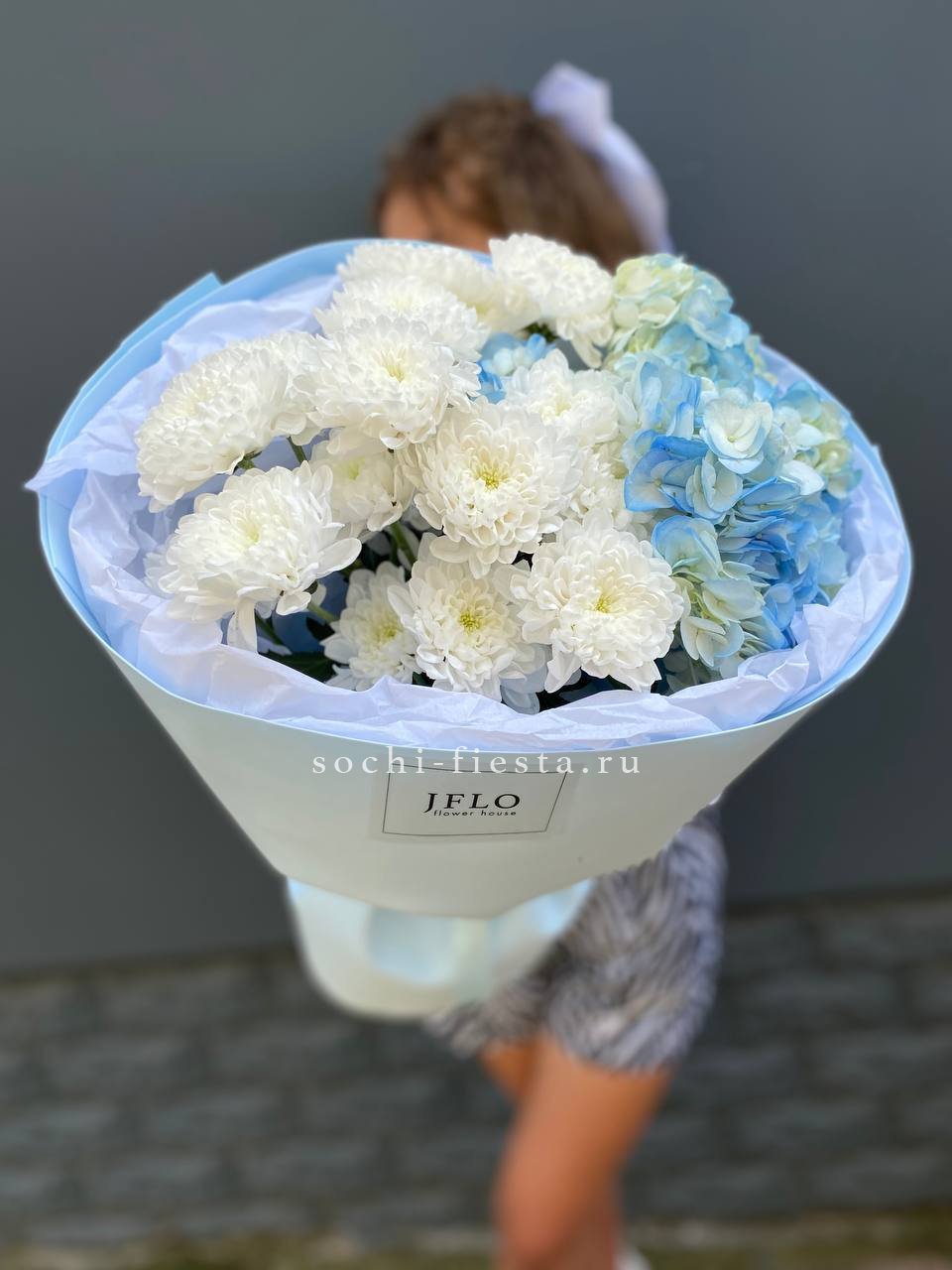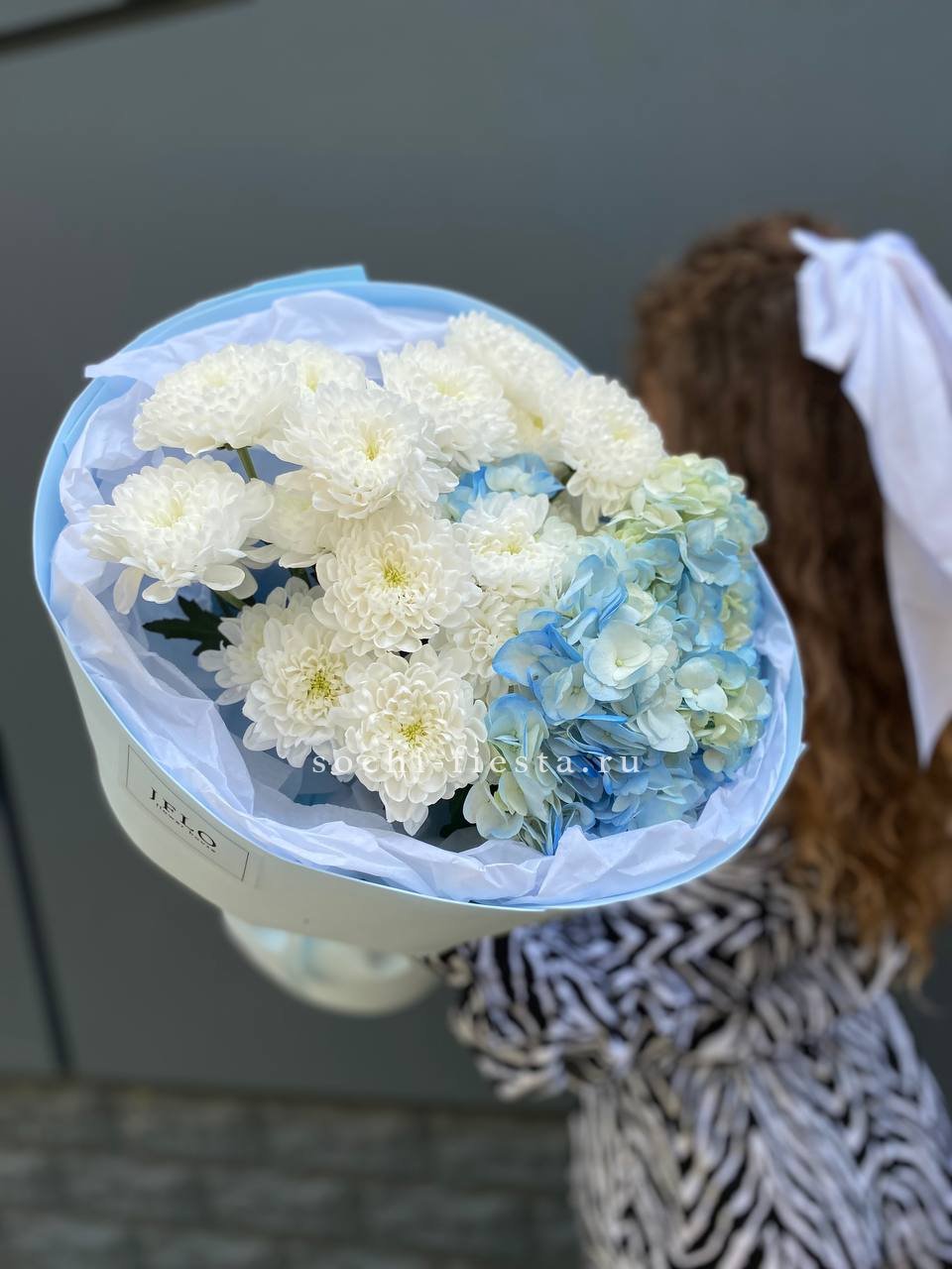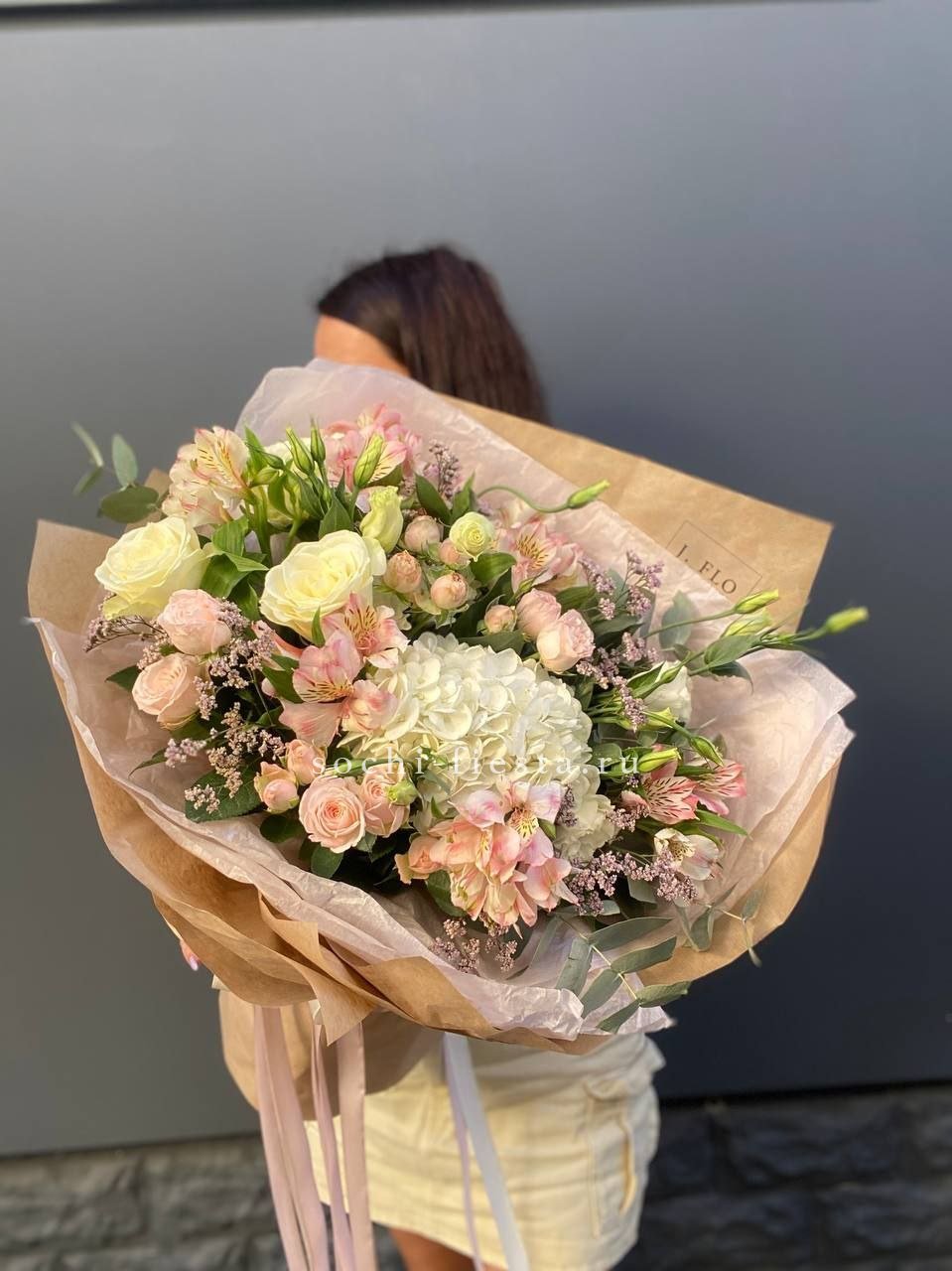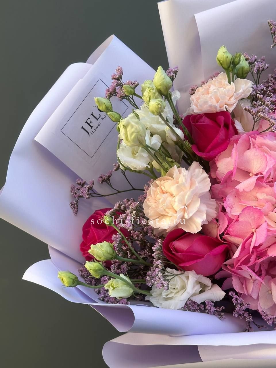 маттиола, розы, гортензия, диантусы, хризантемы , лента и дизайнерская пленка.