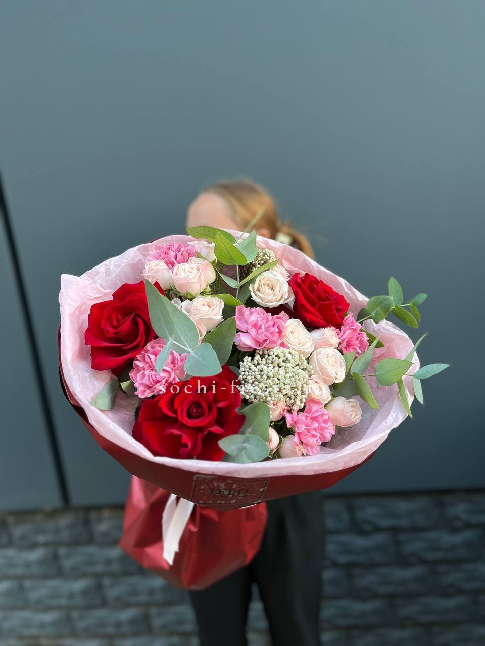 красная француская роза, диантусы, бомбастик, озатамус, эвкалипт, упаковка.