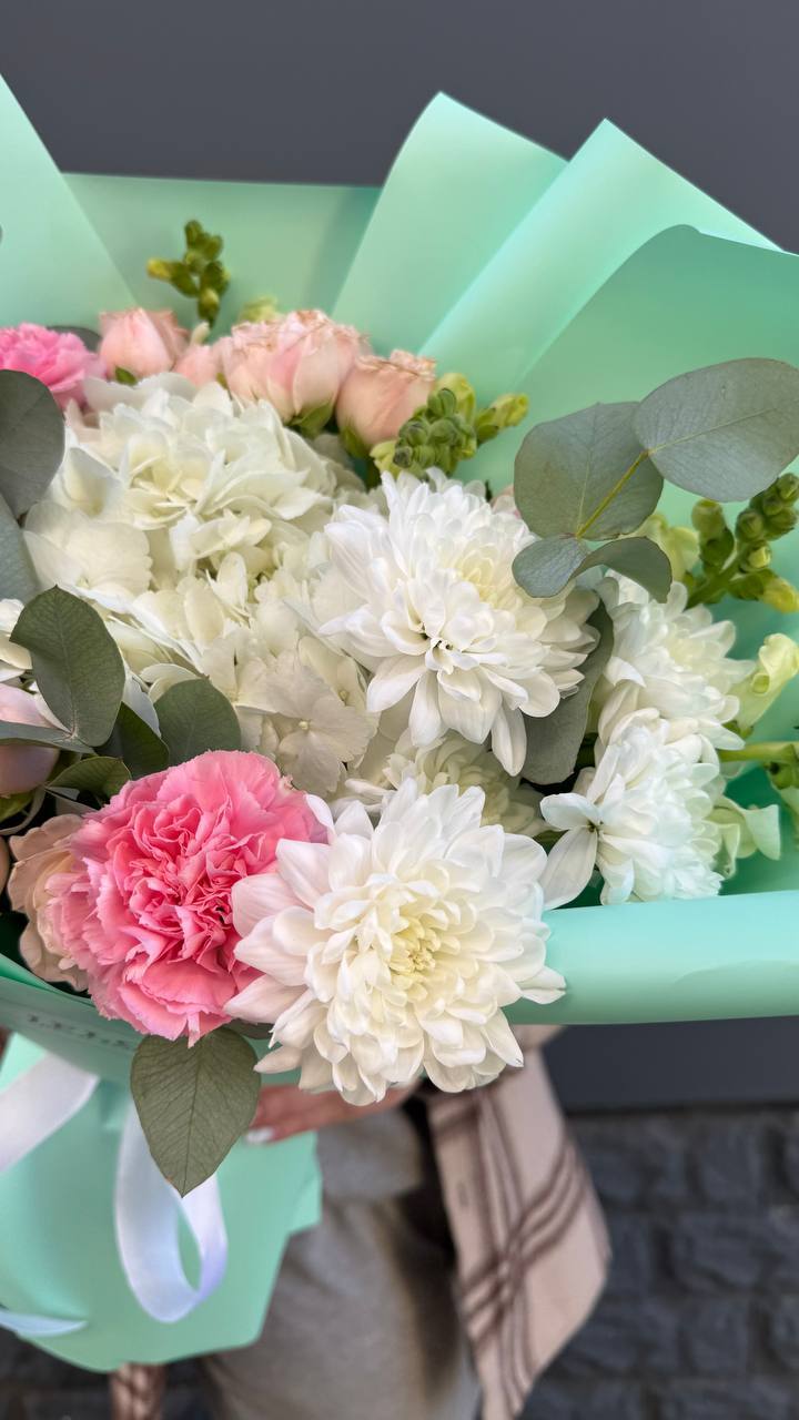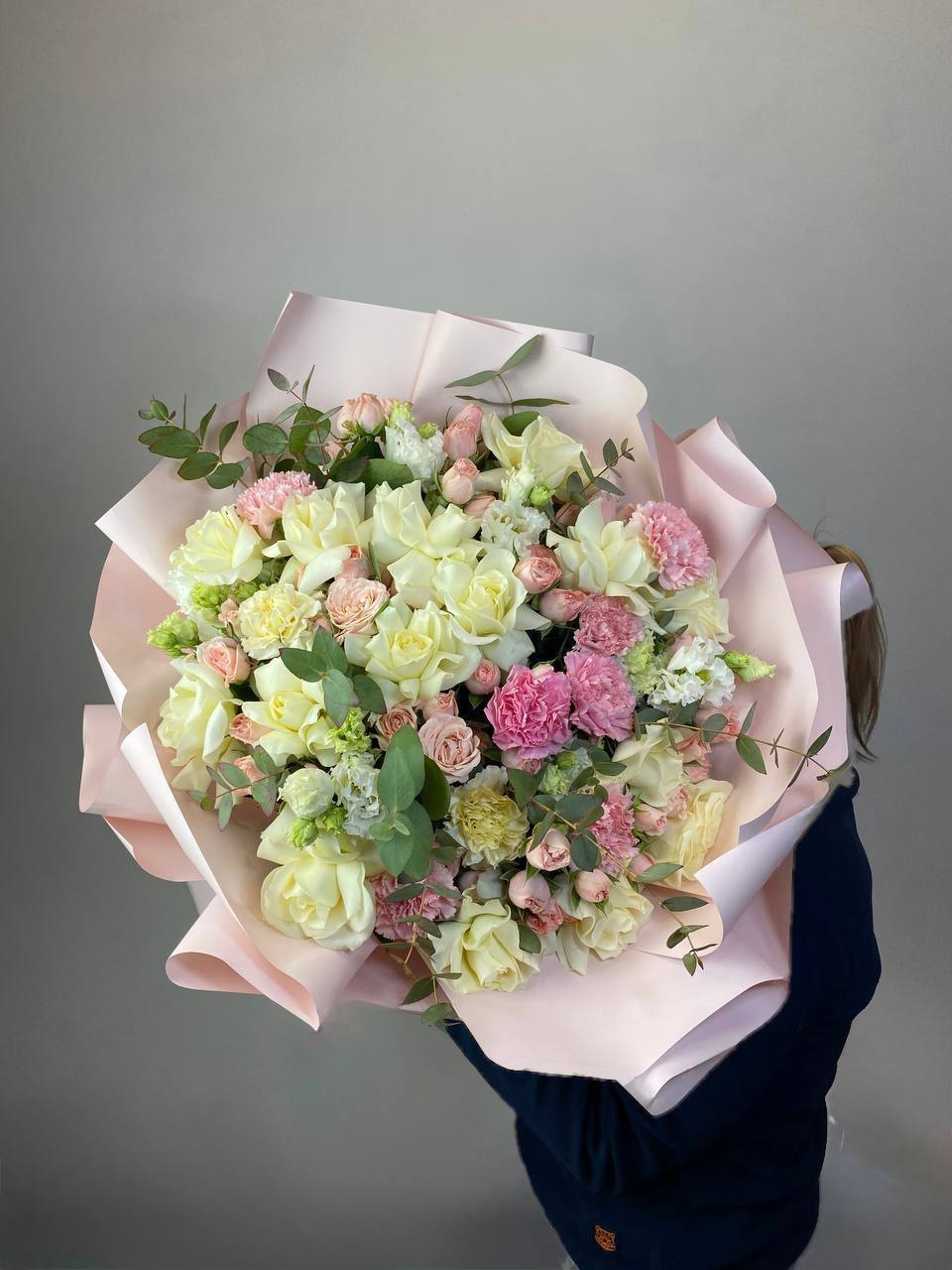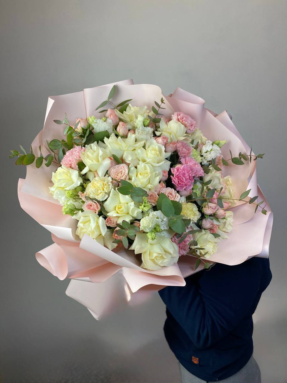 Белые розы и эустома образуют воздушный объем, где каждый бутон дышит свободно. Диантус добавляет графичности, а эвкалипт создает прохладную дымку по краям. Букет для тех, кто ценит легкость и современную флористику.