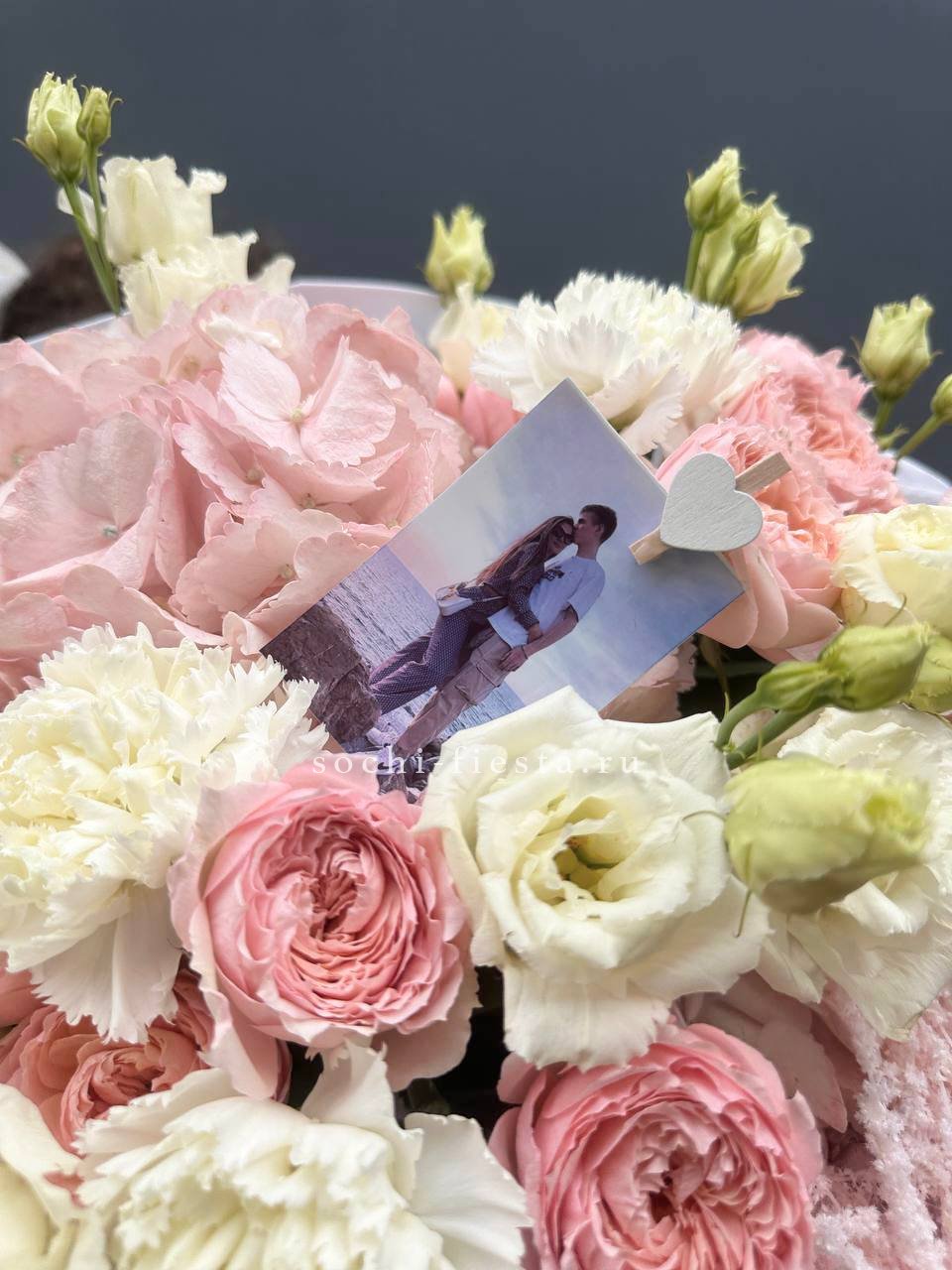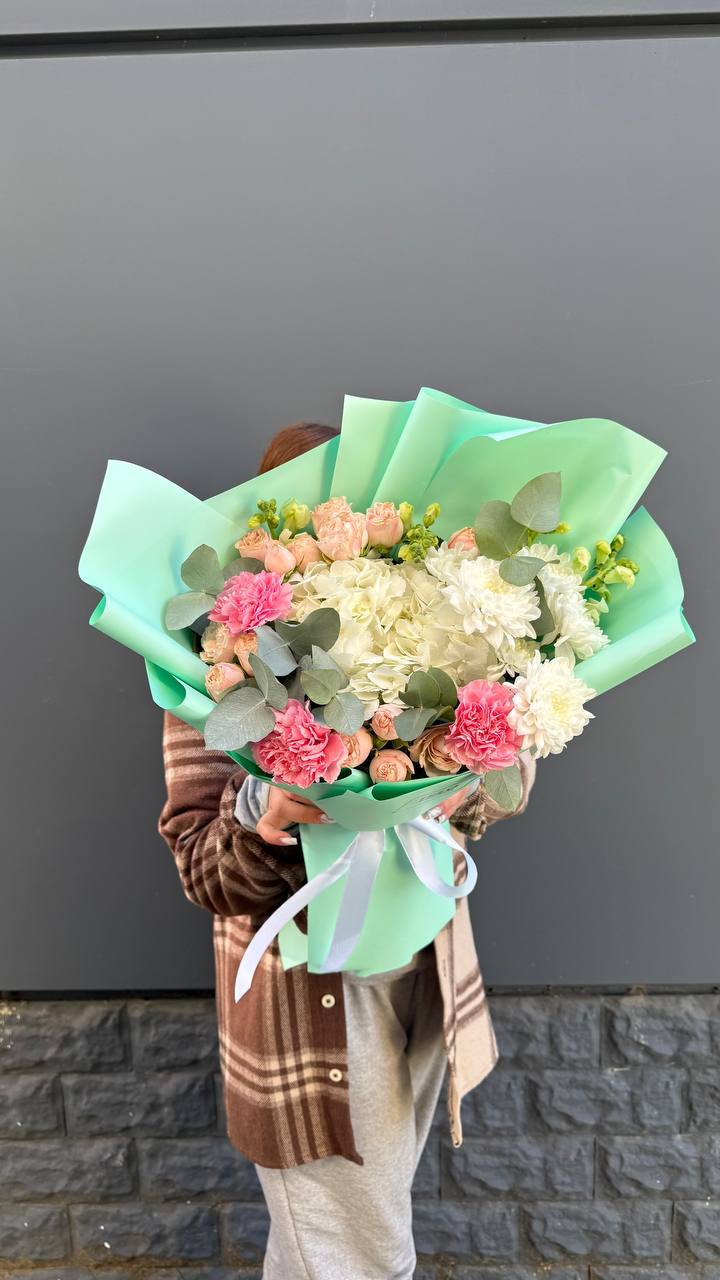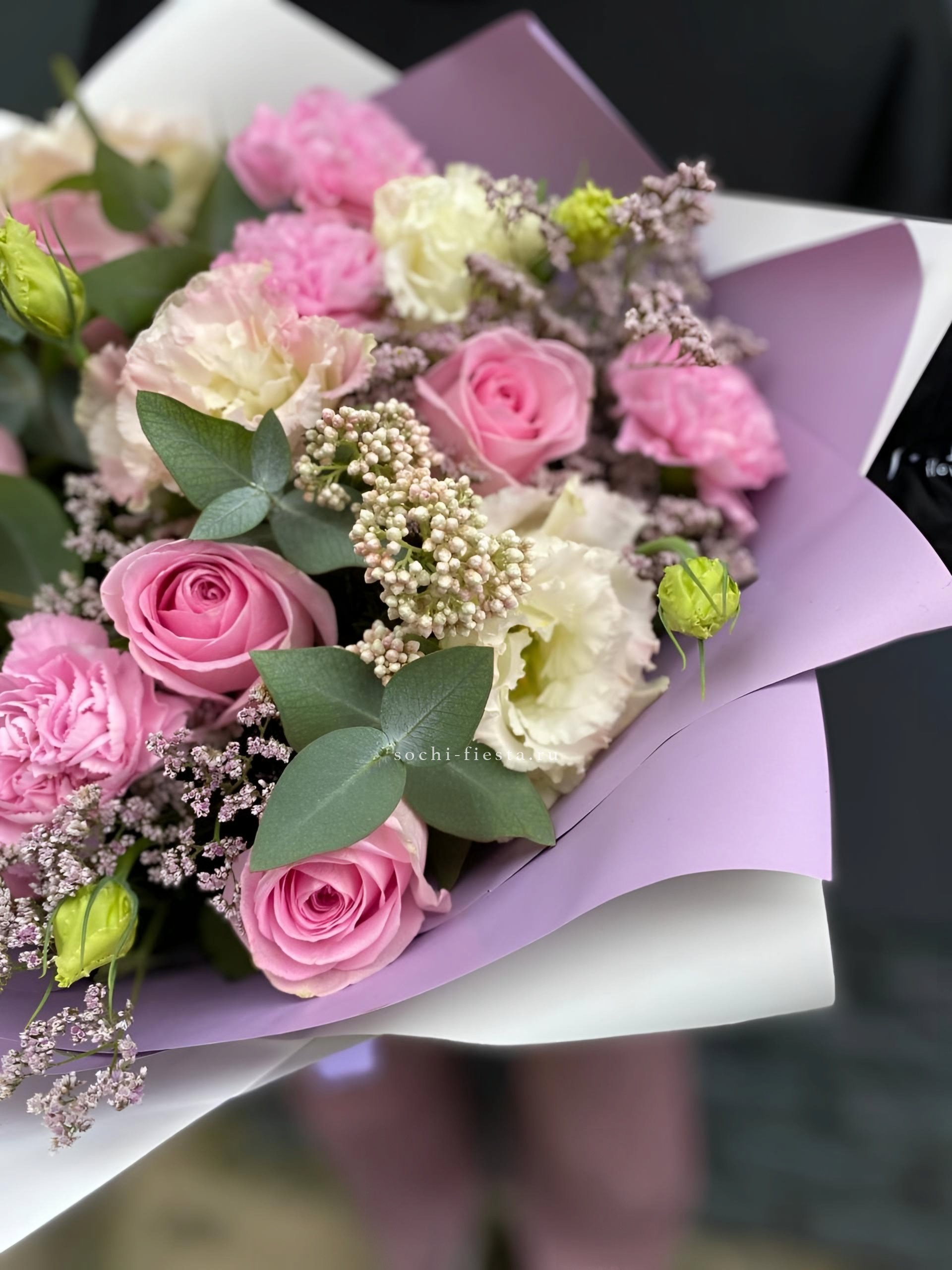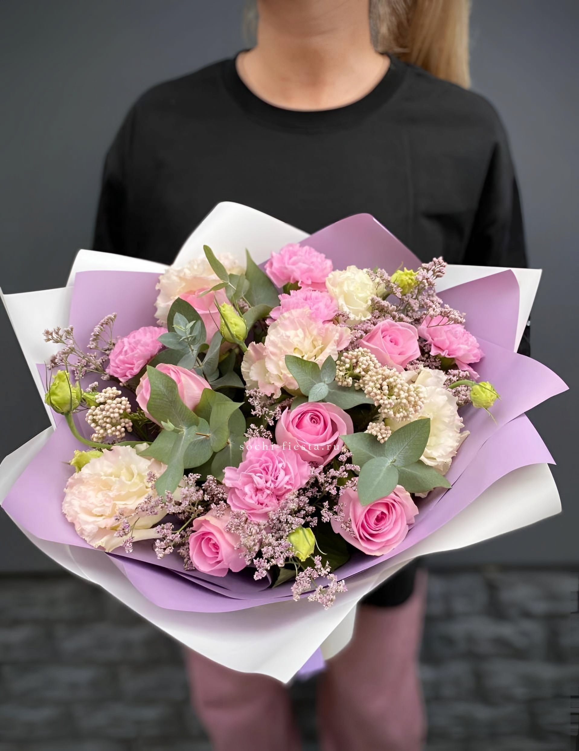 Белые розы и эустома образуют воздушный объем, где каждый бутон дышит свободно. Диантус добавляет графичности, а эвкалипт создает прохладную дымку по краям. Букет для тех, кто ценит легкость и современную флористику.