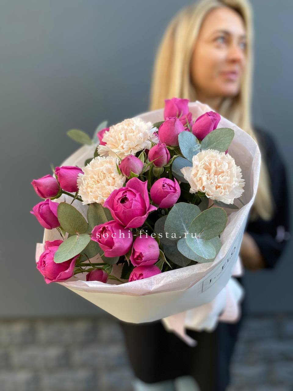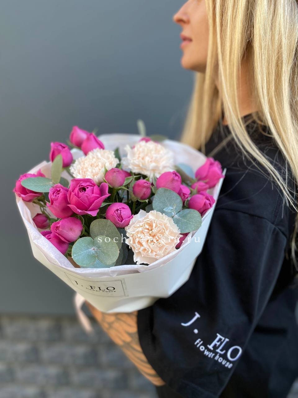 диантус, бомбастик, белые розы, эвкалипт, эустома, упаковка.