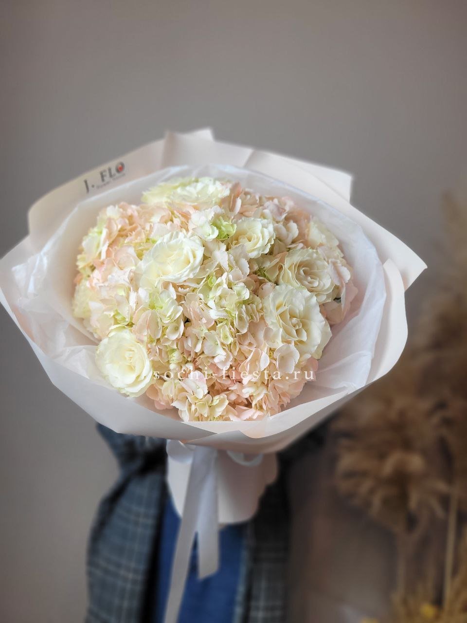 Пышные шапки гортензии создают воздушный объём, а белые розы добавляют графичности. Букет держит форму и легко размещается в любом пространстве.