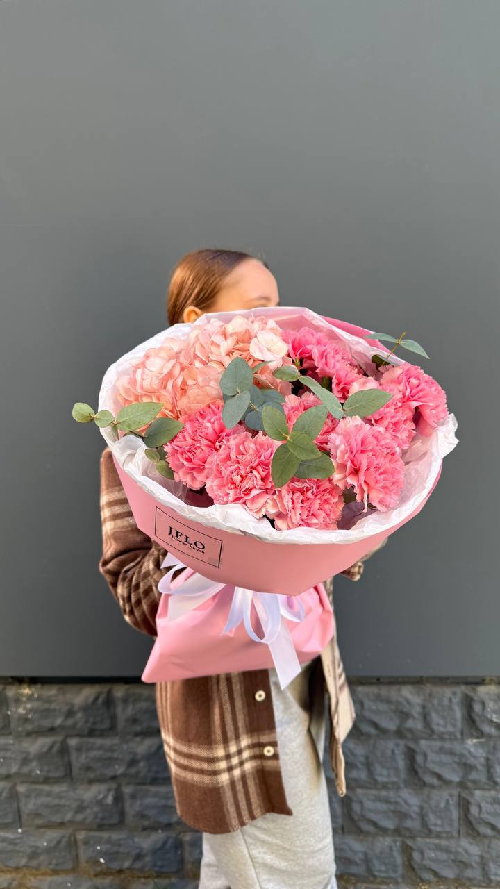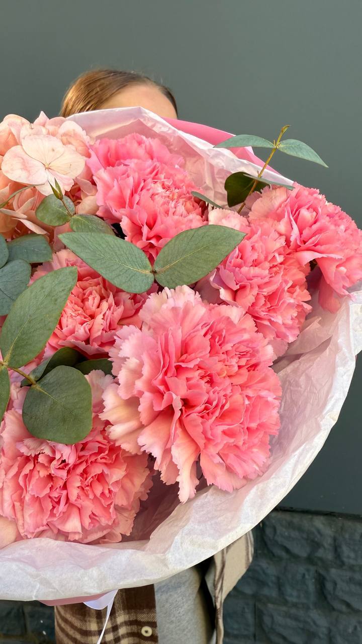 Розы и диантусы образуют лёгкий микс с выразительной игрой фактур. Эвкалипт добавляет графичности и свежести общей картине. Компактная сборка удобна для размещения на столе или комоде.
