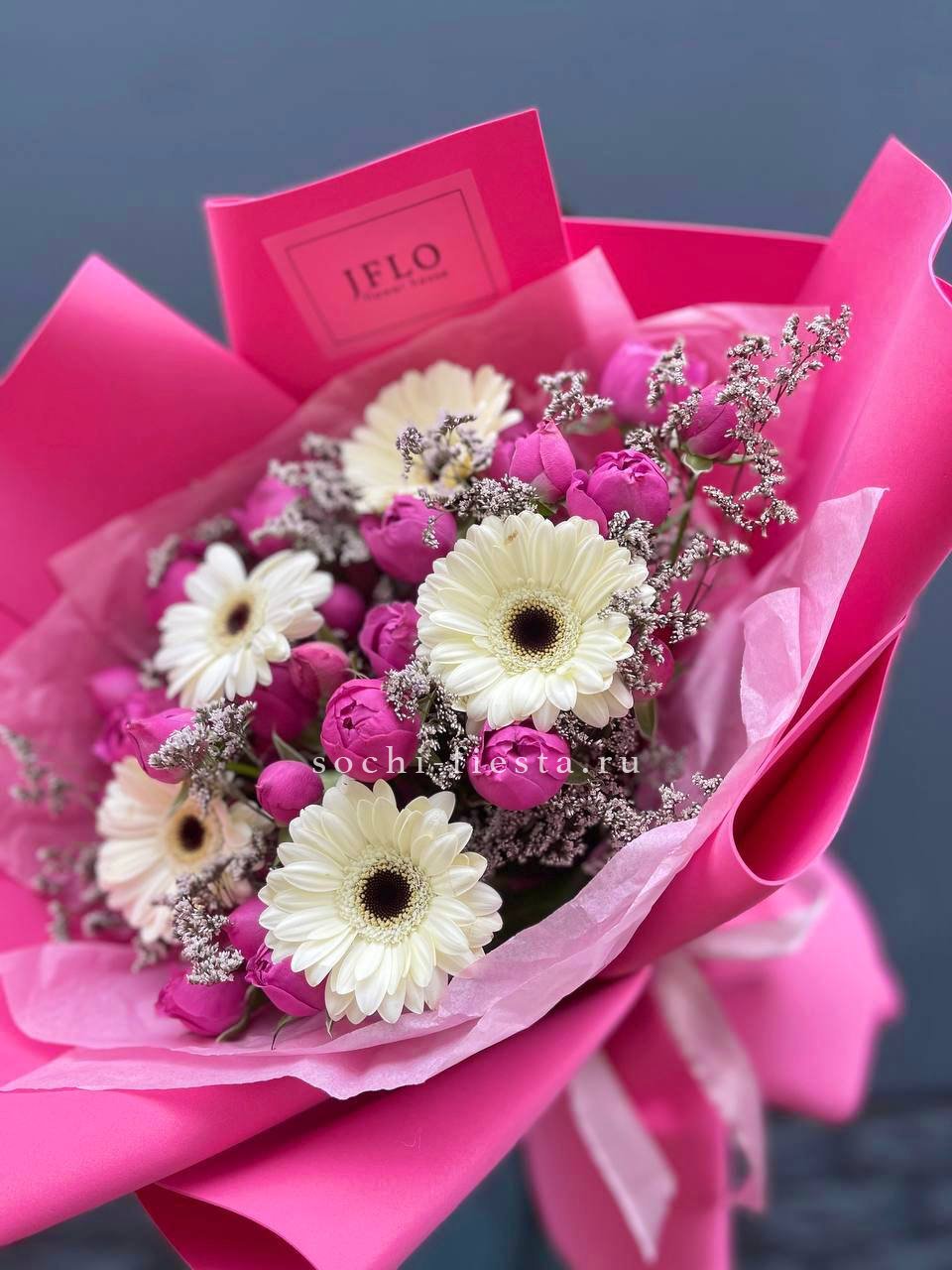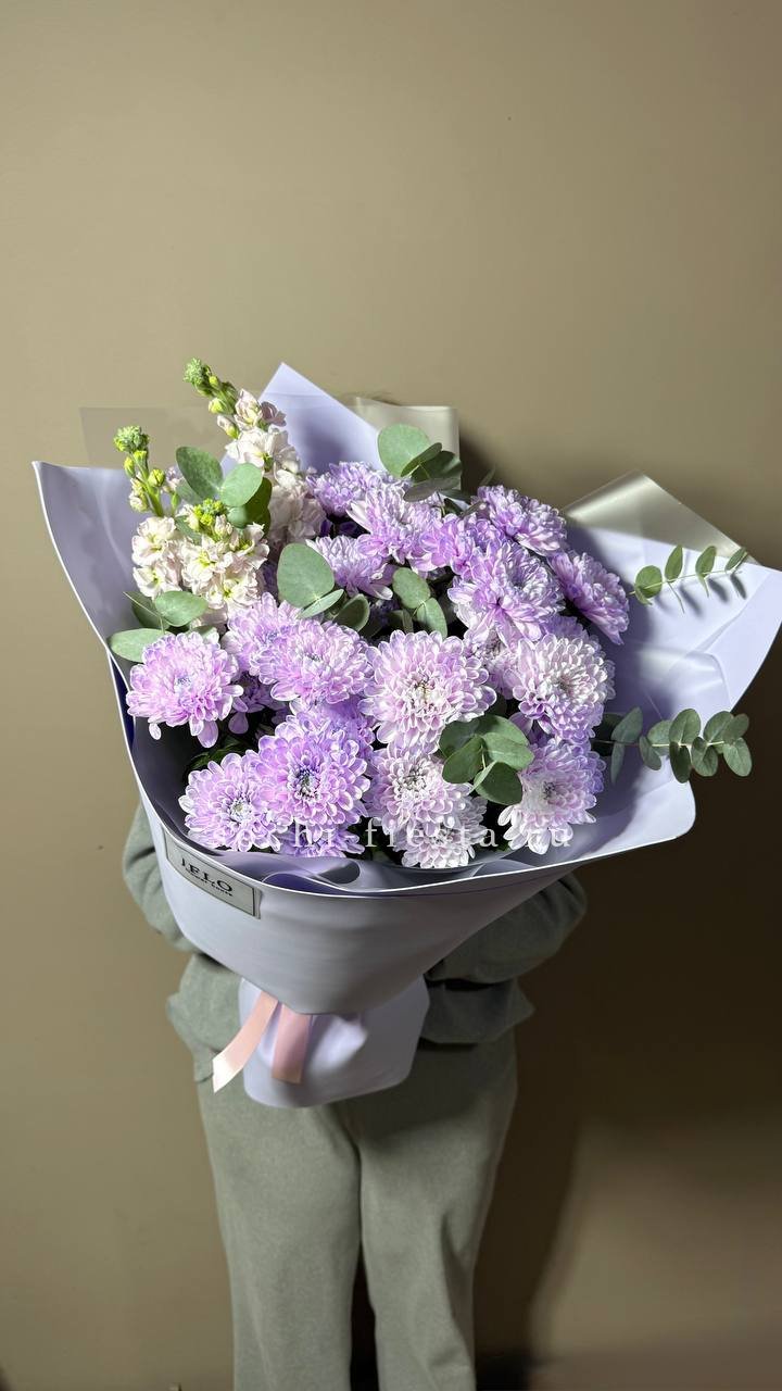 Розовые розы и диантусы окружены пышными соцветиями маттиолы и бомбастика. Композиция собрана плотно, каждый цветок поддерживает соседний, создавая объемную округлую форму. Букет держит силуэт и выглядит цельно с любого ракурса.