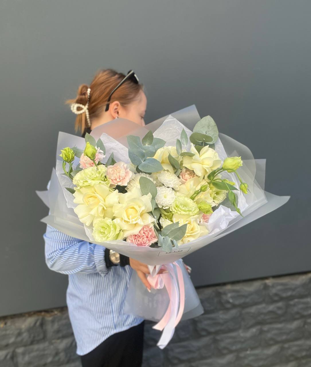 роза одноголовая, диантус, кустовые розы, сопутствующие сезонные цветы, лента, дизайнерская упаковка.