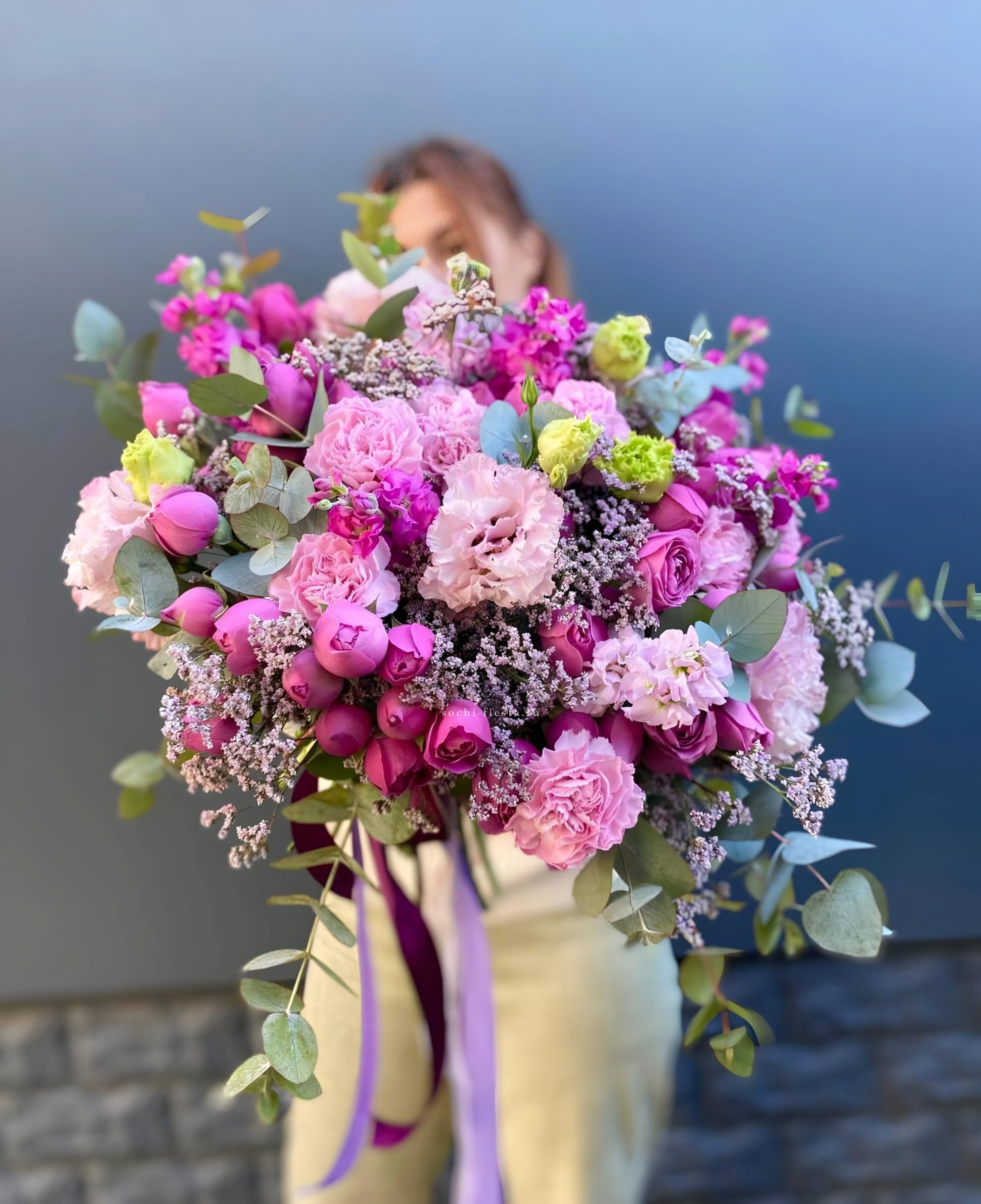 гортензия, французские розы, маттиола, лимониум, дианстусы, эвкалипт, ковыль и дизайнерская упаковка.