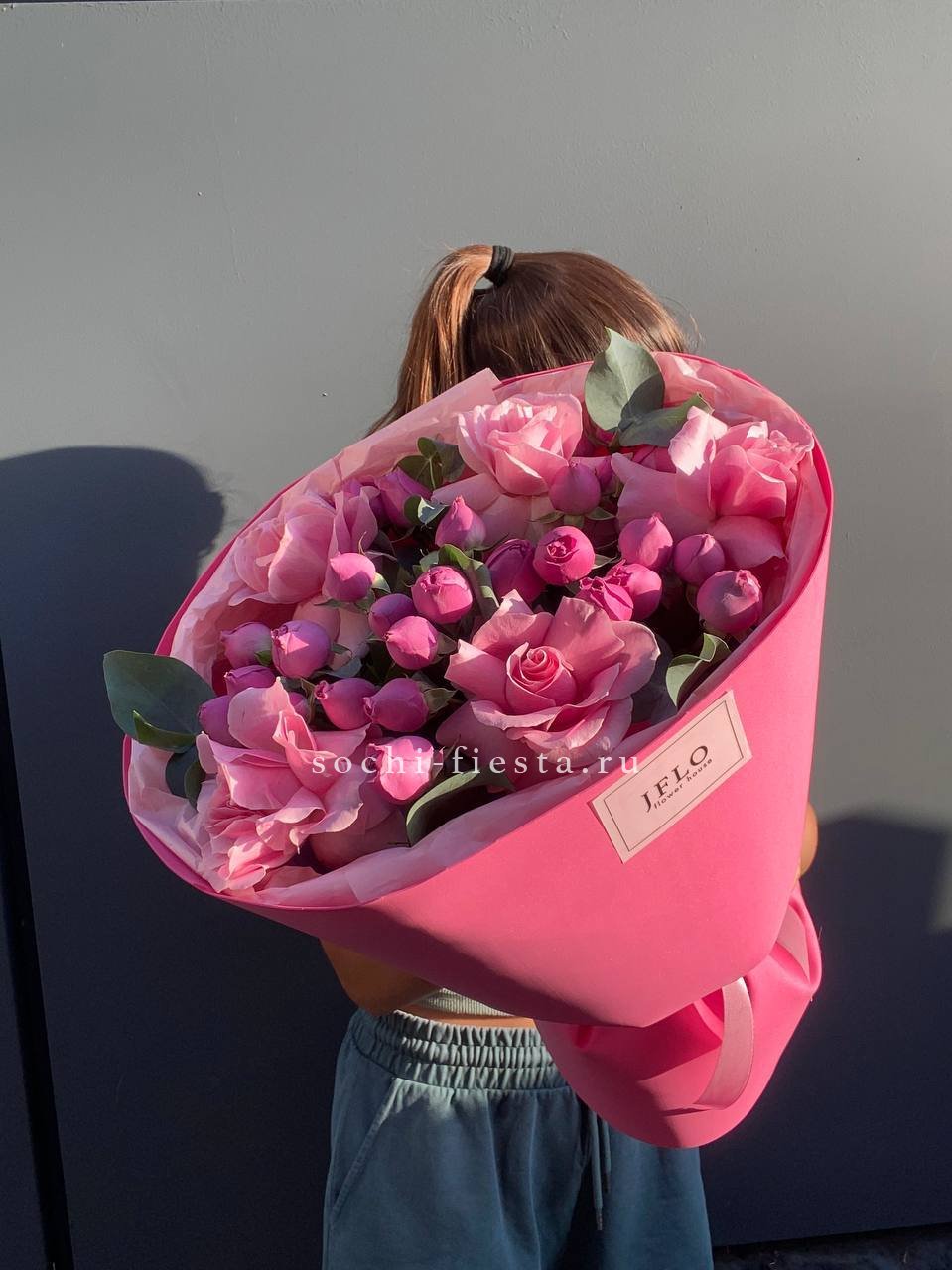 Мягкие пионовидные формы переплетаются с классическими розовыми бутонами в плотной округлой композиции. Эвкалипт освежает палитру и придаёт букету завершённость.