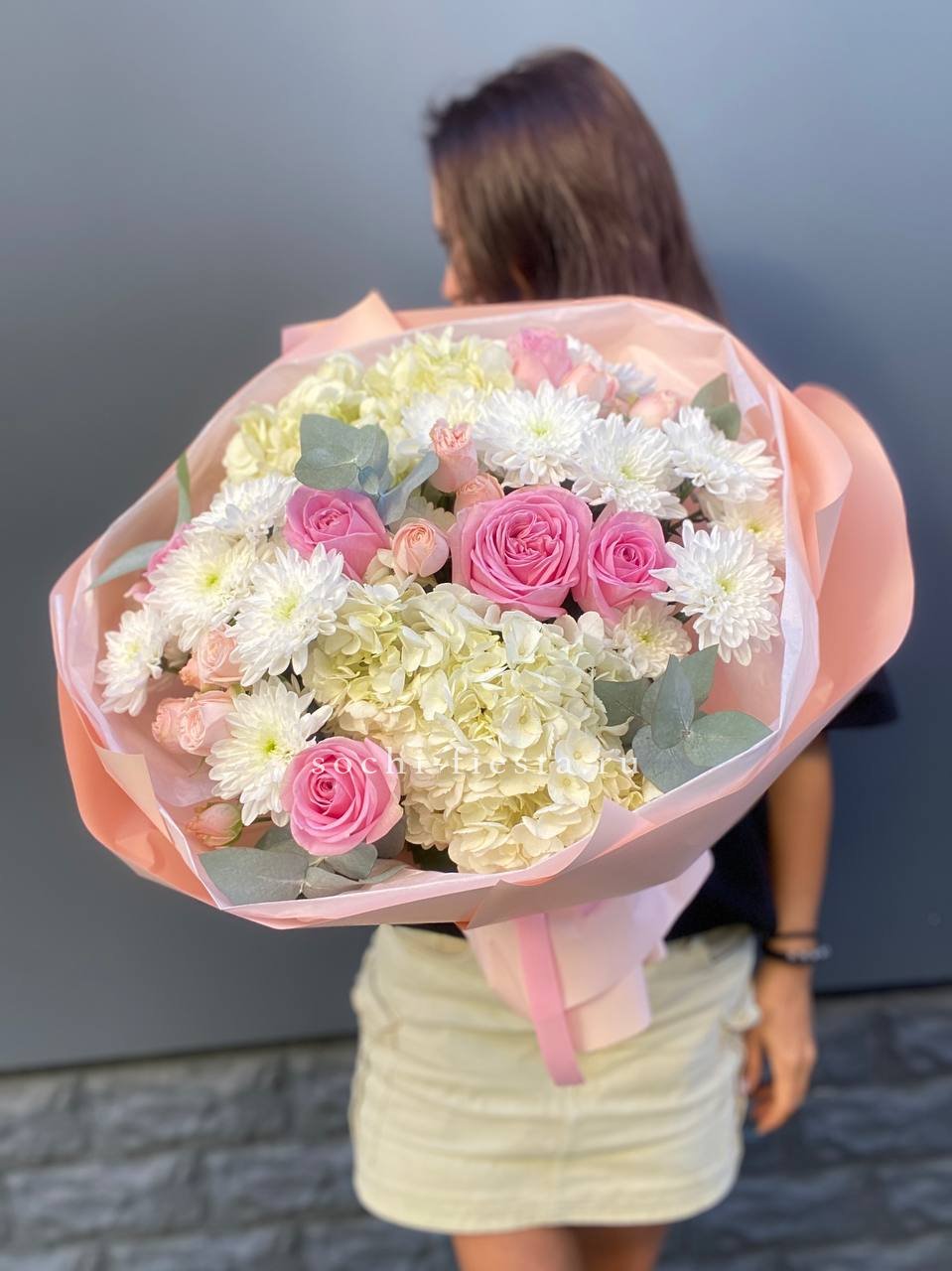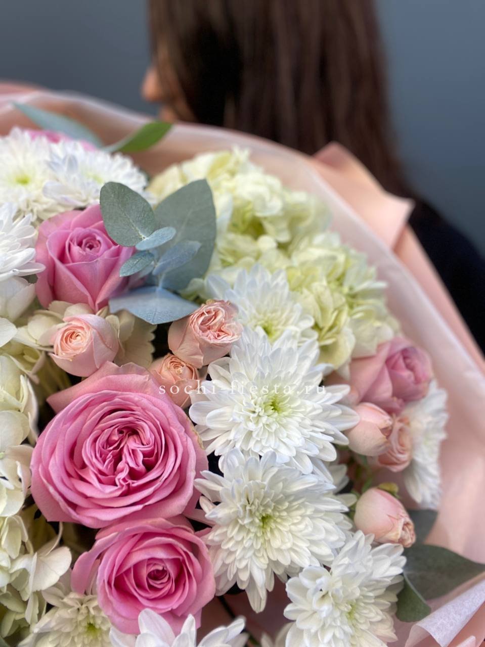 гортензия, пионовидная кустовая роза,  розовая роза, хризантема,  эвкалипт, лента, дизайнерская пленка.