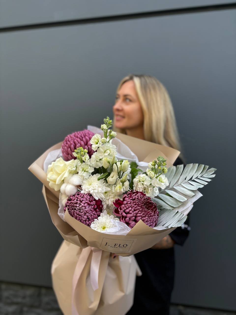 хризантемы Бигуди, маттиола, лист чика (возможна замена на эвкалипт), хризантема кустовая,  эустома, хлопок, лента, дизайнерская упаковка.