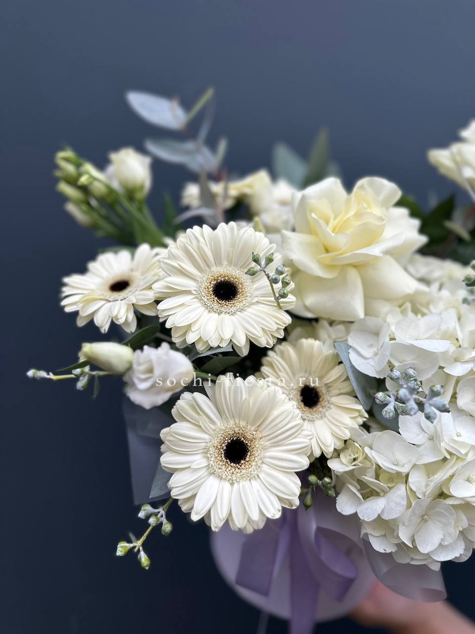 гортензия, герберы, розы французские, эустомы, эвкалипт, оазис, шляпная коробка, пленка, лента.