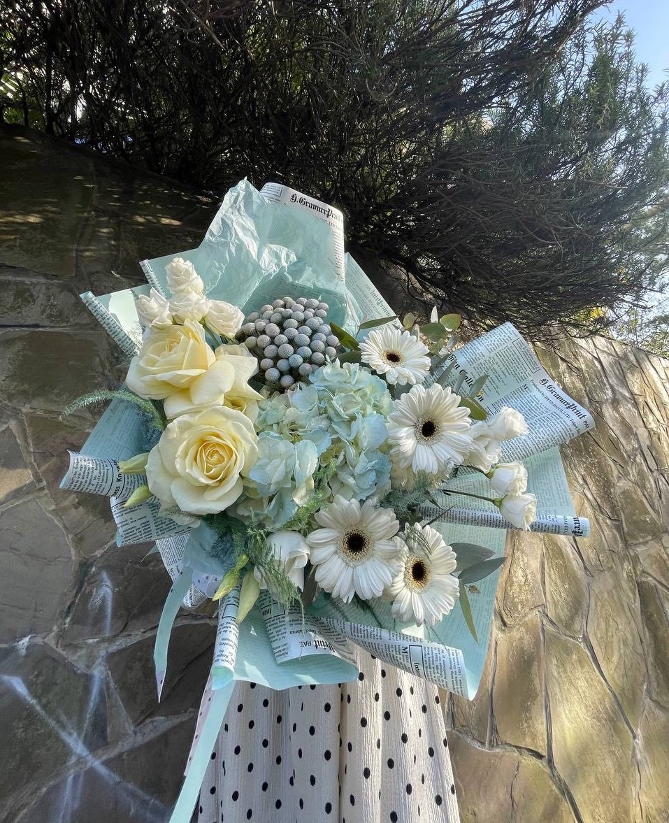 Воздушная композиция собрана из гортензии, роз, эустомы и гербер в голубых и белых оттенках. Бруния и эвкалипт добавляют объём, а аспарагус создаёт лёгкую дымку вокруг цветов. Букет хорошо держит форму и долго сохраняет свежесть.