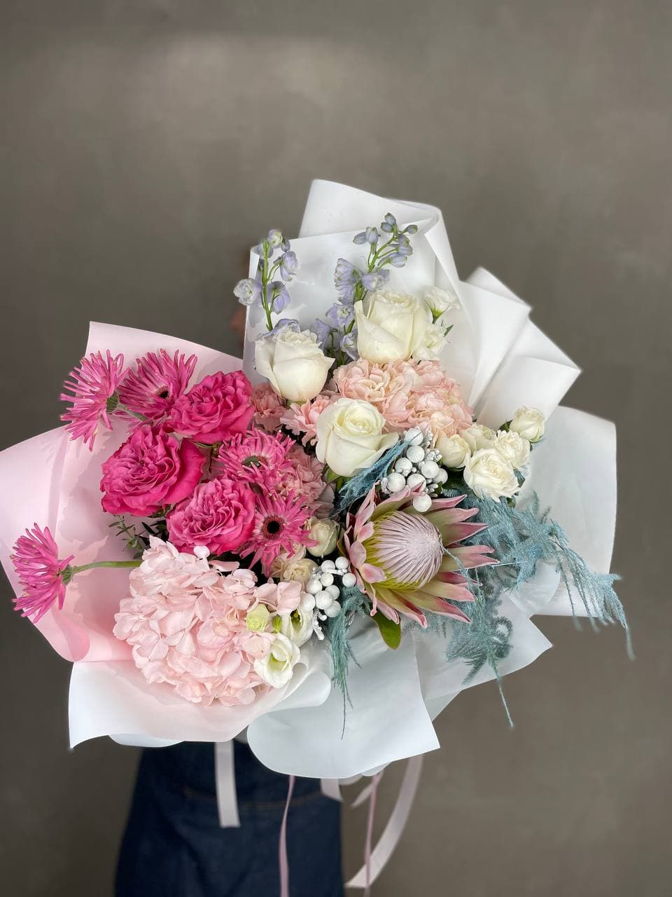 гортензия, диантус, кустовая пионовидная роза, эустома, орхидеи (или аналог), эвкалипт, лента, дизайнерская упаковка.