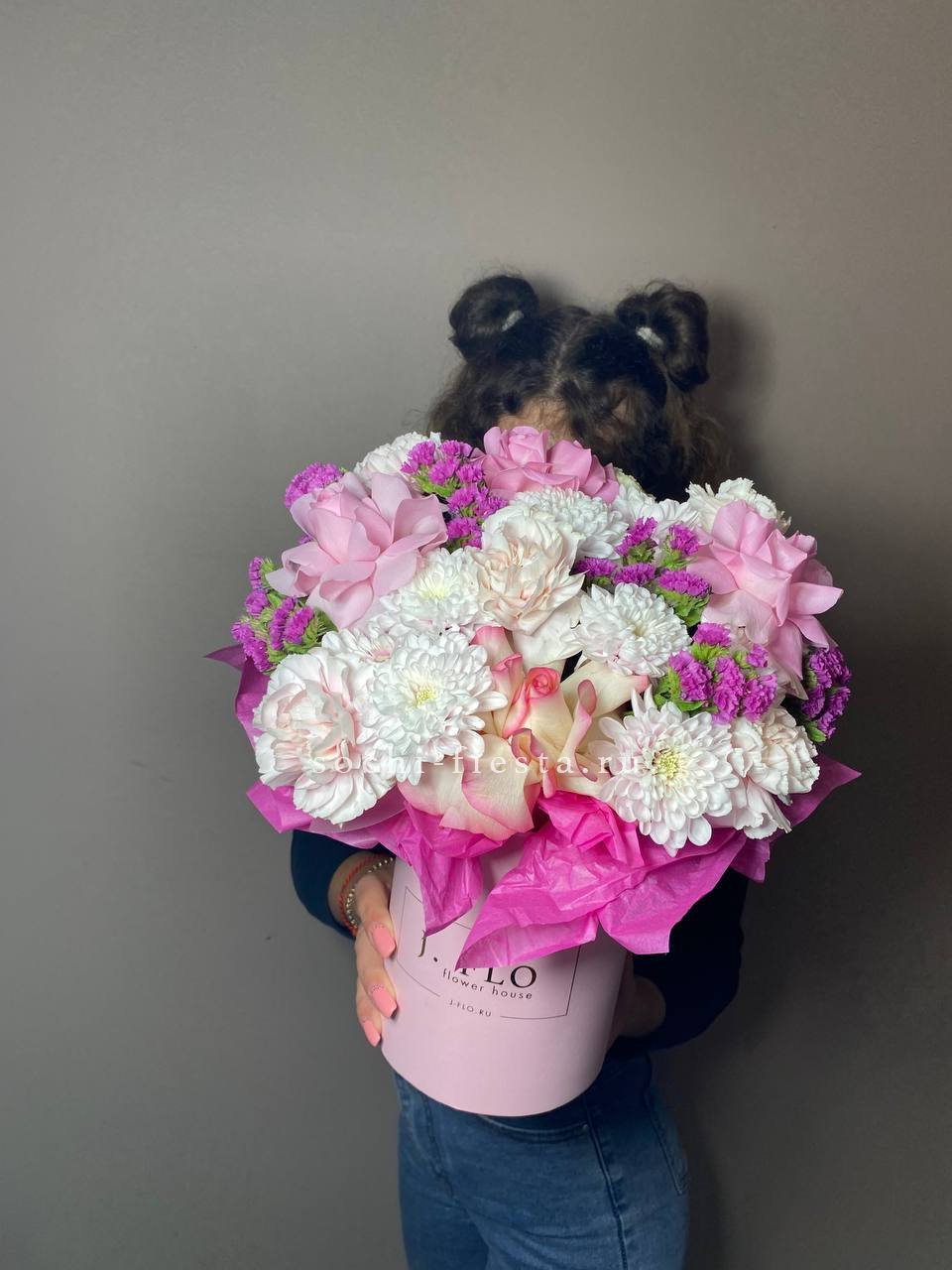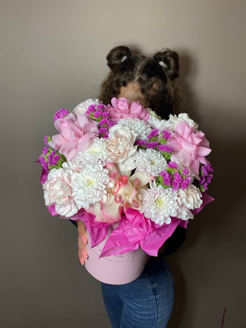 Микс из пионов, лилий и эустом в объёмном цилиндре создаёт впечатление пышного сада. Белые розы и маттиолы наполняют пространство светом, а статица добавляет графики.