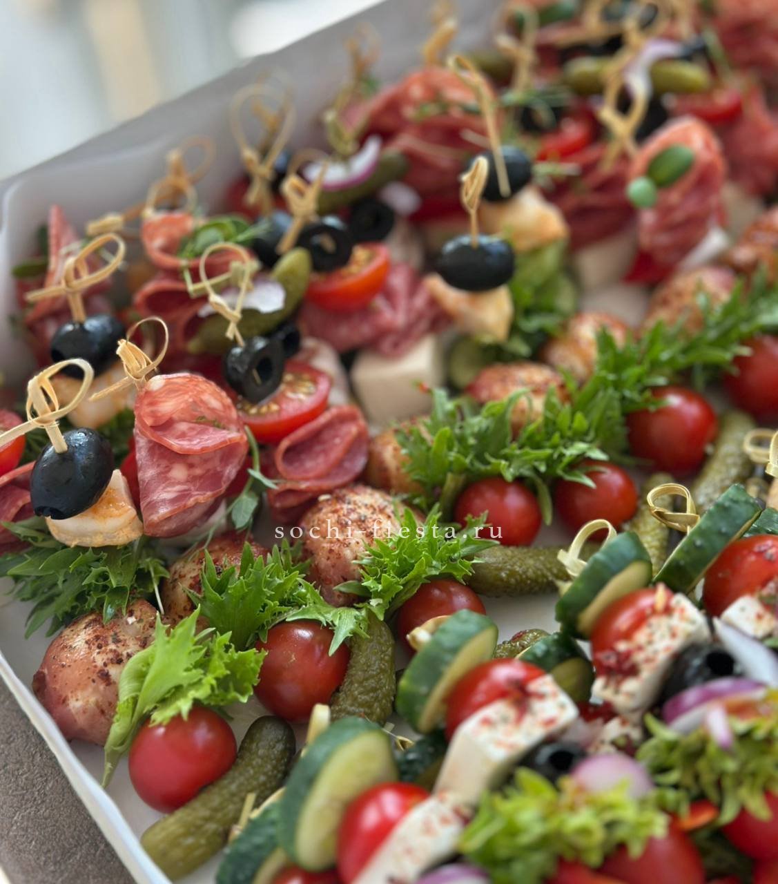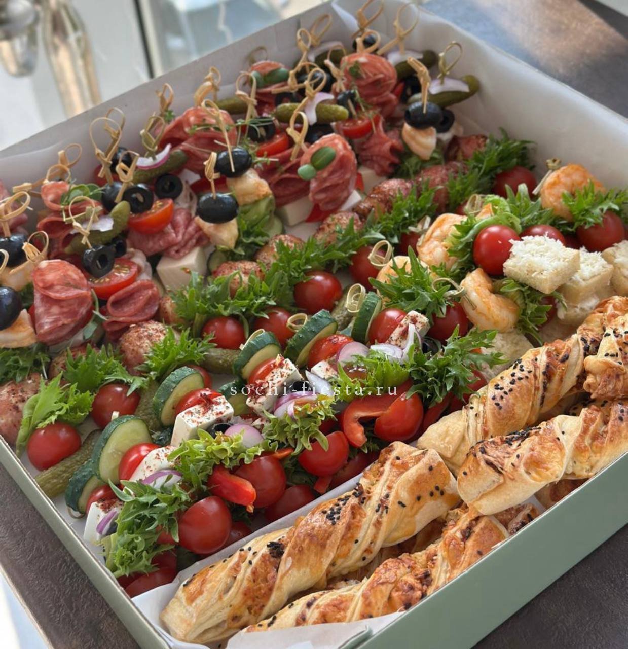 мит боллы- 12 шт. Сырные вафли- 6 шт. Овощная и фруктовая корзинки. Сосиски в тесте- 6 шт. Мини-оладушки- 80 шт. Улитки с ветчиной и сыром- 6 шт.