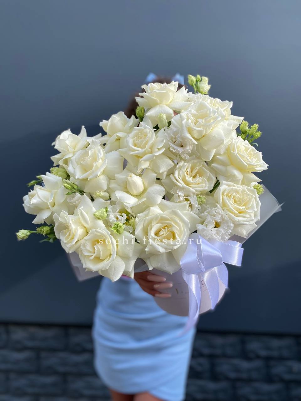Белые розы и эустома образуют монохромную гамму с чистыми линиями. Эвкалипт добавляет свежести и завершает лаконичную форму композиции.
