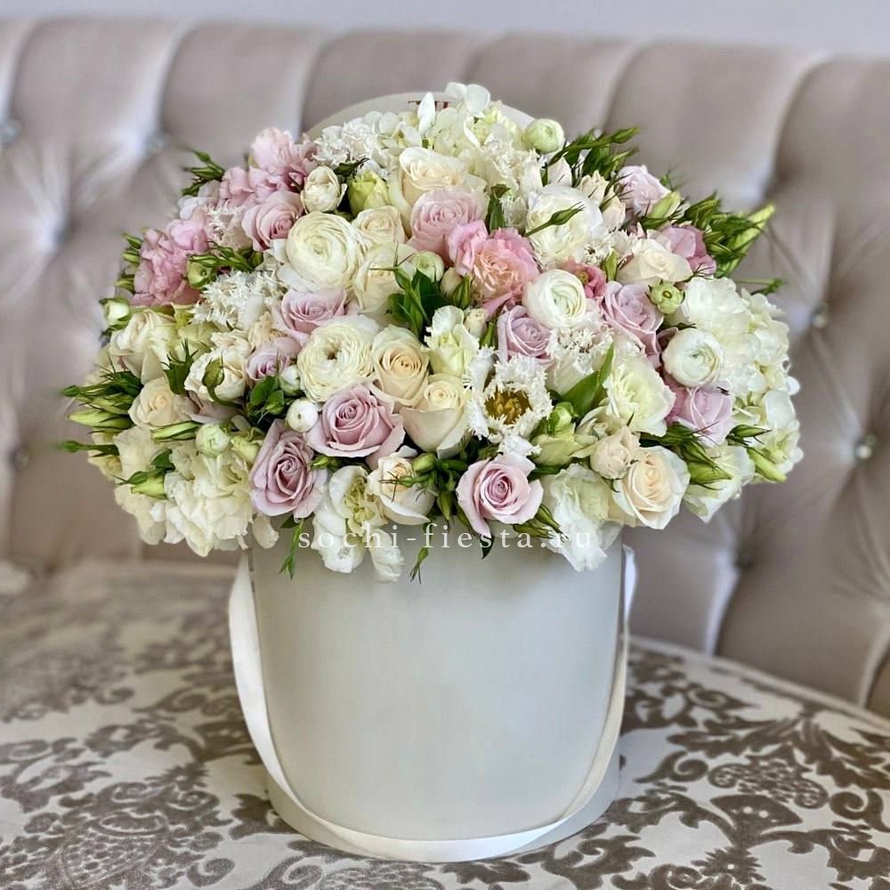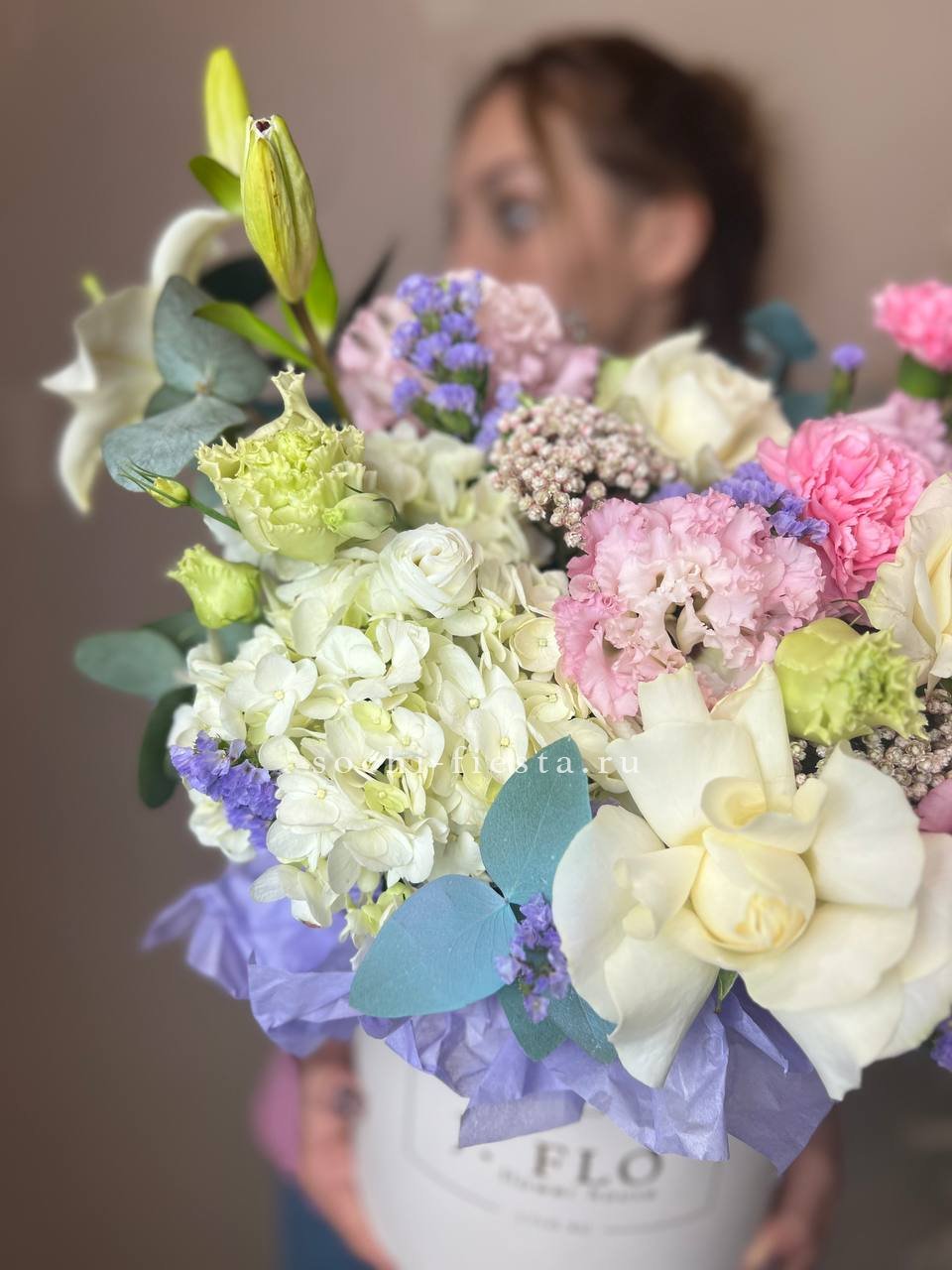 Белоснежные розы и воздушная эустома соседствуют с пышной гортензией и яркими вспышками статицы. Композиция собрана плотно, каждый цветок находит своё место в общем ритме.