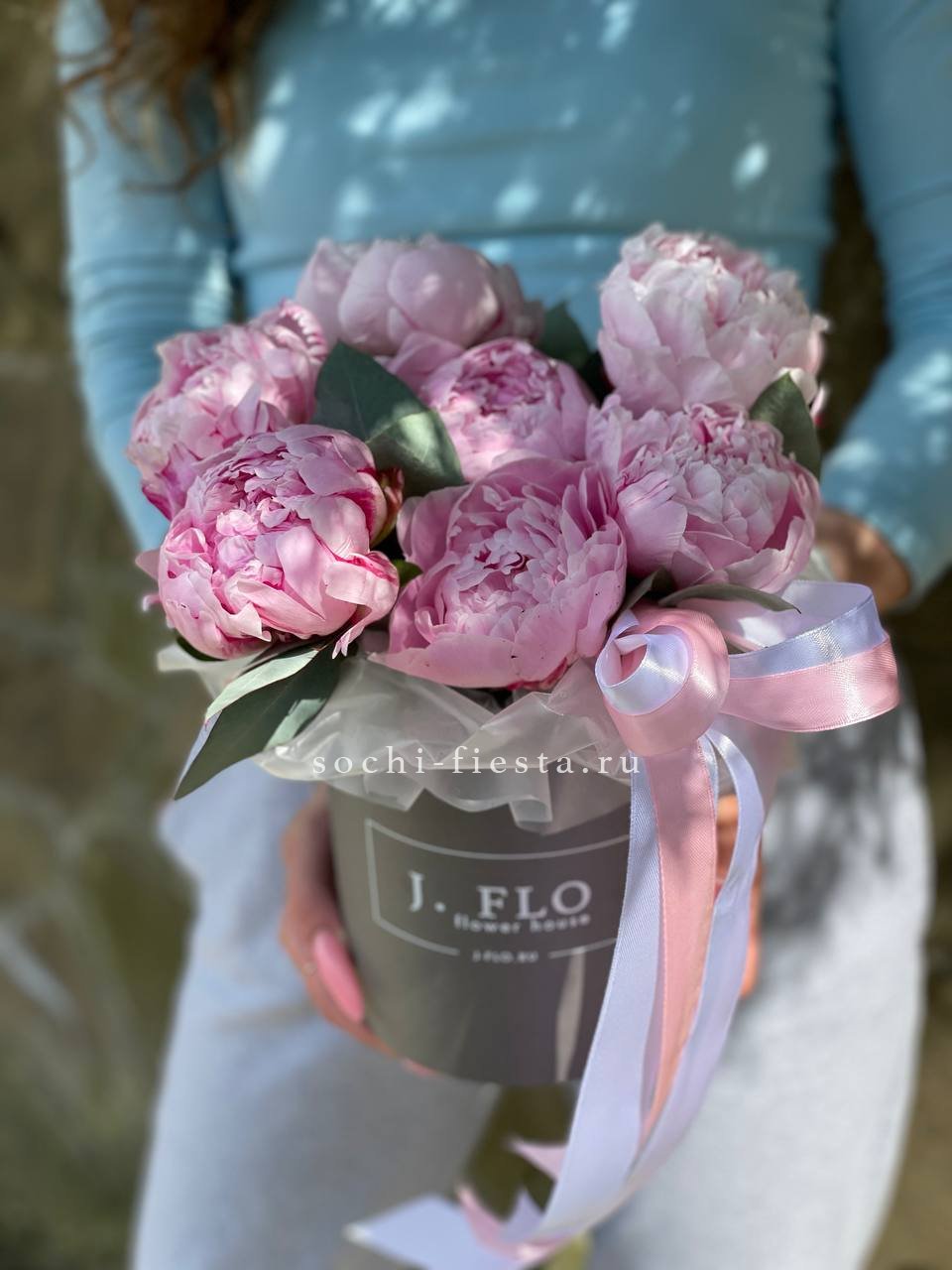 Семь пионов в компактном цилиндре образуют плотную композицию с выразительным силуэтом. Серебристая зелень эвкалипта задаёт вертикальный ритм и добавляет воздушности общей форме.