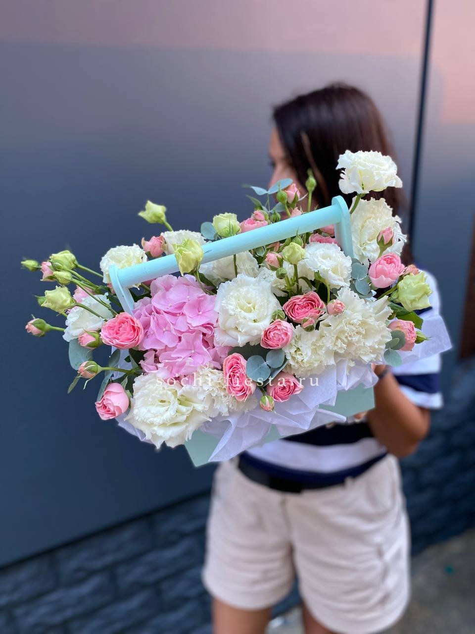 гортензия, диантус, кустовая роза, эустома, эвкалипт, гипсофила/бруния/хамелациум, деревянный ящик, пиафлор, лента Состав композиции может быть незначительно изменен флористом в процессе изготовления с соблюдением стилистики, фактуры и цветовой гаммы оригинала.