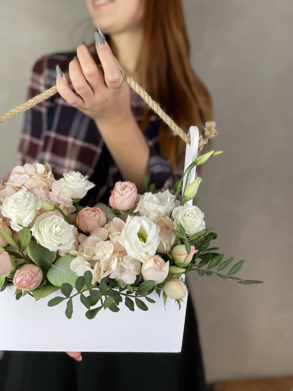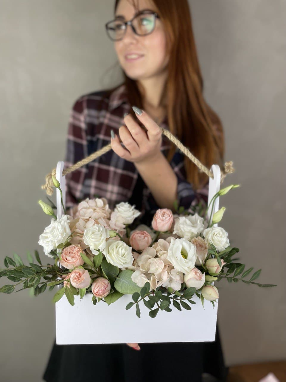 Гортензия формирует пышную основу композиции, окружённую мелкими соцветиями диантуса и кустовой розы. Эвкалипт добавляет графичные линии, а эустома создаёт воздушные акценты в деревянном ящике.