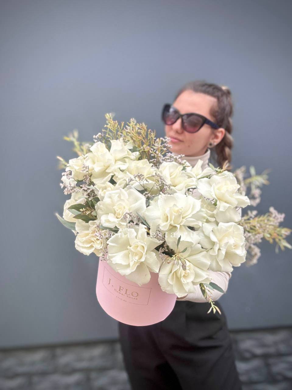 Семнадцать белых роз с раскрытыми лепестками образуют плотную округлую форму в цилиндре. Эвкалипт и лимониум добавляют фактурные переходы между бутонами.