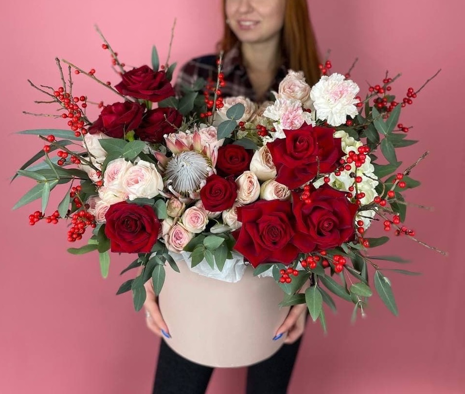 Объемные головки пионовидных роз сплетаются с фактурной протеей и ягодами илекса. Композиция наполняет пространство цветом и создает ощущение живого сада в боксе.