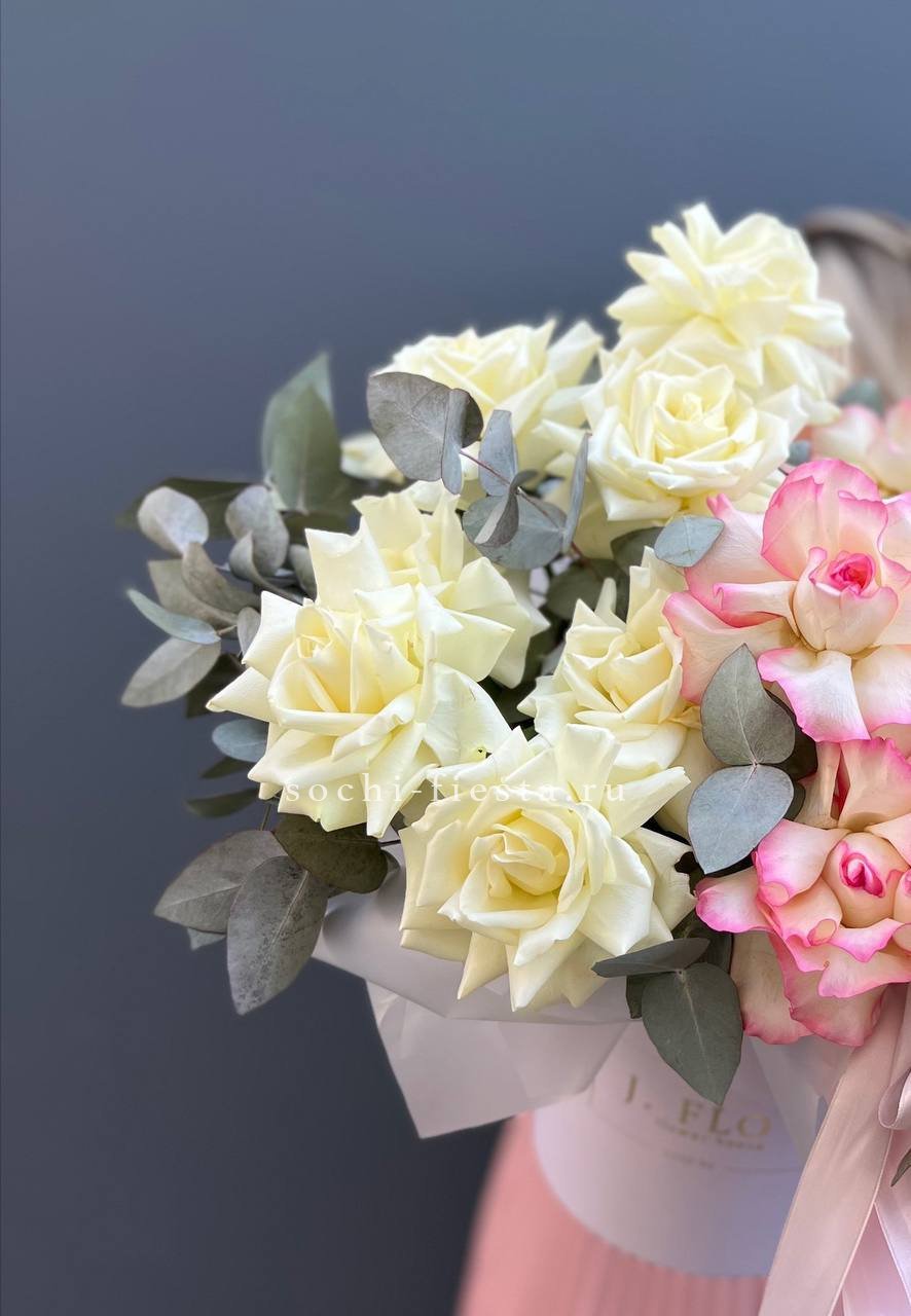 Розы, герберы и пышные соцветия гортензии в розово-голубой гамме наполняют бокс свежестью и легкостью. Каждый цветок раскрывается по-своему, создавая многослойную композицию. Готовое решение для яркого момента.