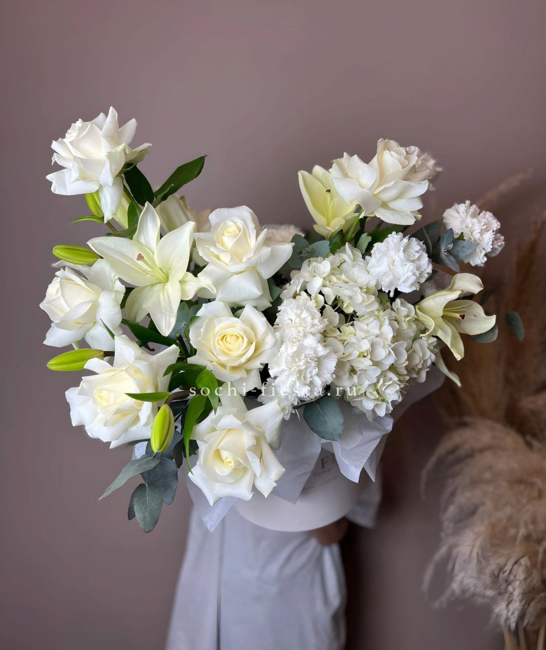 Белые лилии и кустовая роза встречаются с лотосом и диантусом в небольшом боксе. Эвкалипт добавляет свежести легкой водной палитре.