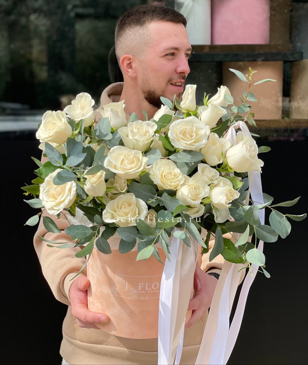 Французские розы и маттиола задают романтичный тон, а амарантус спускается мягкими каскадами за пределы бокса. Перья вносят графичную легкость в общую картину.