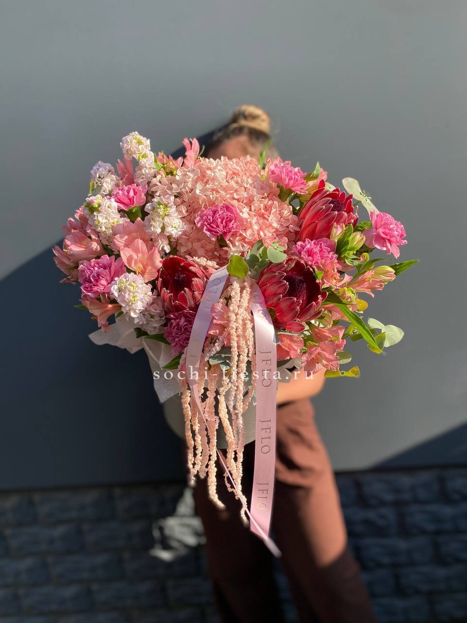 Протеи привносят графичность и экзотичный силуэт. Матиолла и альстромерии смягчают линии, а диантусы расставляют акценты по всей композиции.