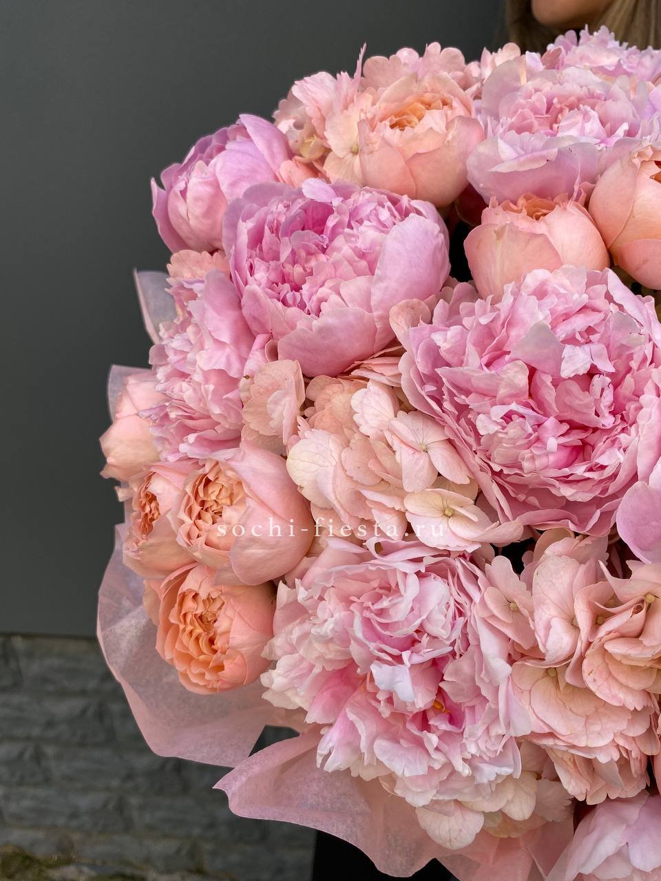 Пионы и кустовые розы собраны плотно, почти без воздуха между бутонами. Гортензия добавляет объём, амарант выстраивает вертикальные линии. Композиция держит форму и не рассыпается.