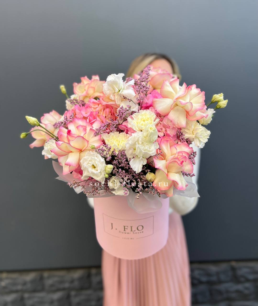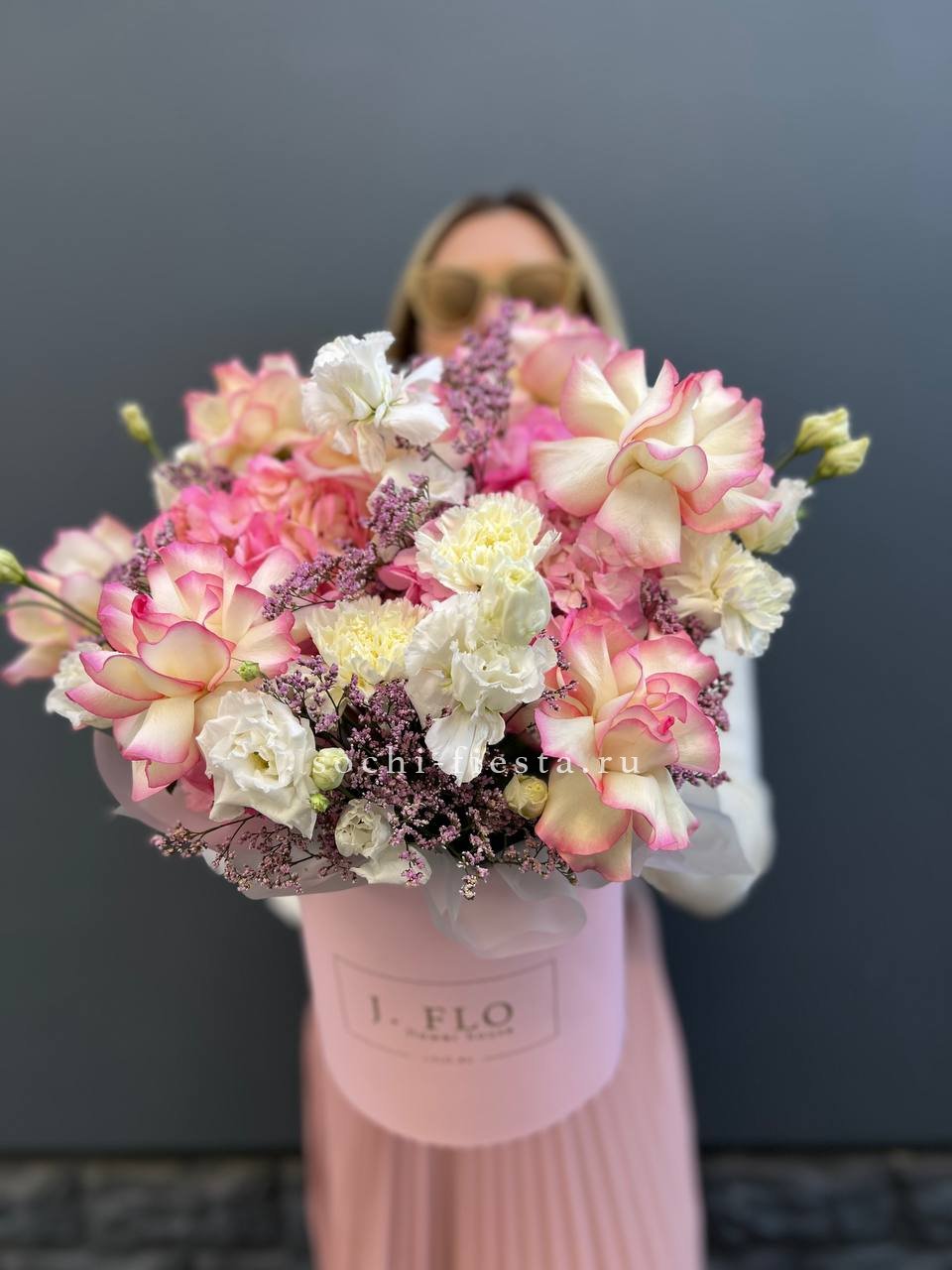 Пионовидные кустовые розы собраны плотно, создавая объёмную композицию с живой текстурой. Лимониум и эвкалипт добавляют воздушности, а цилиндр собирает всё в компактную форму.