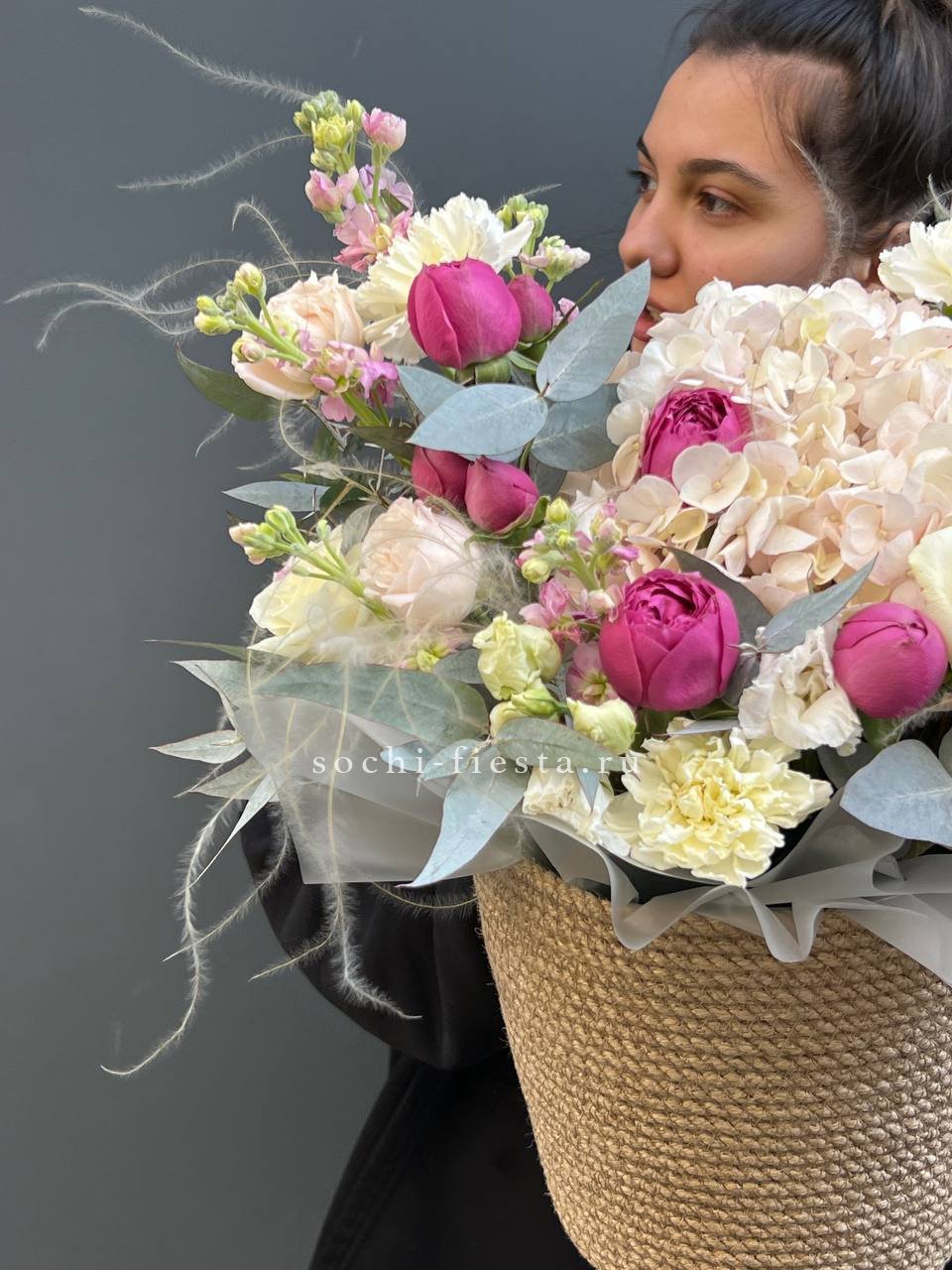 белые и розовые розы, гортензия, эвкалипт в джутовом кашпо.
